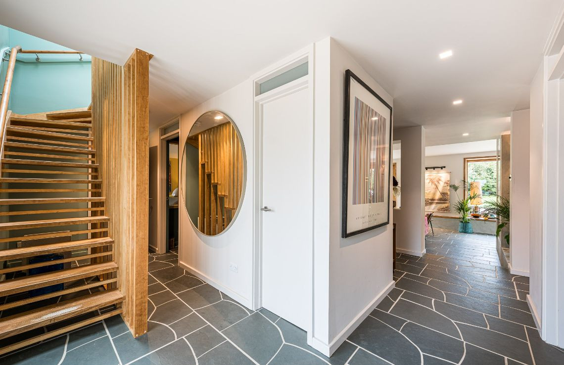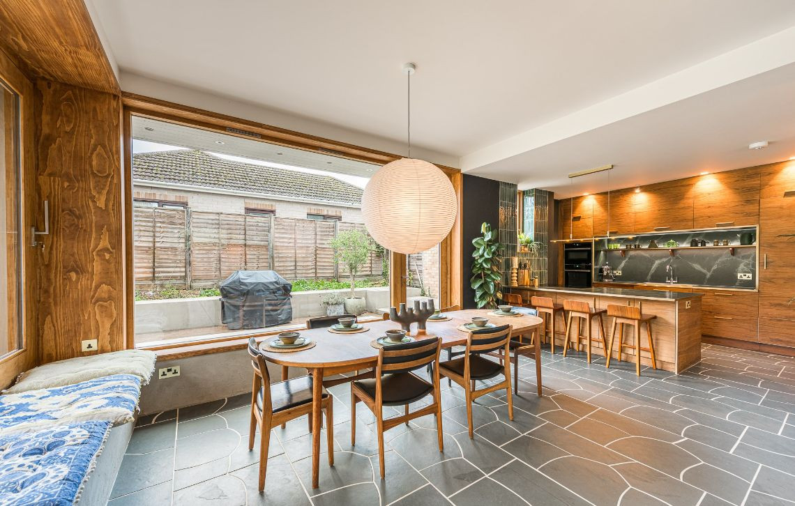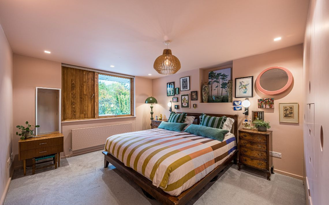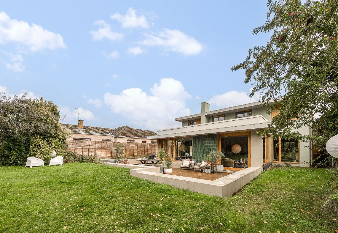 An architecturally designed shoot home featuring Mid-Century Modern decor and open-plan living. It has high ceilings and lots of natural light. Huge, open living space with mixed, natural materials. 4 x bedrooms. Master walk-in dresser and study.