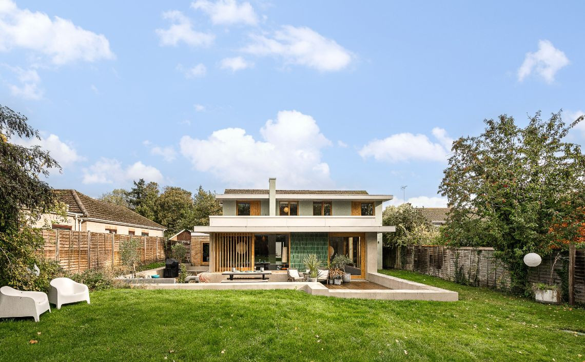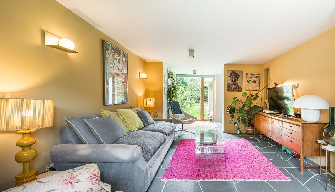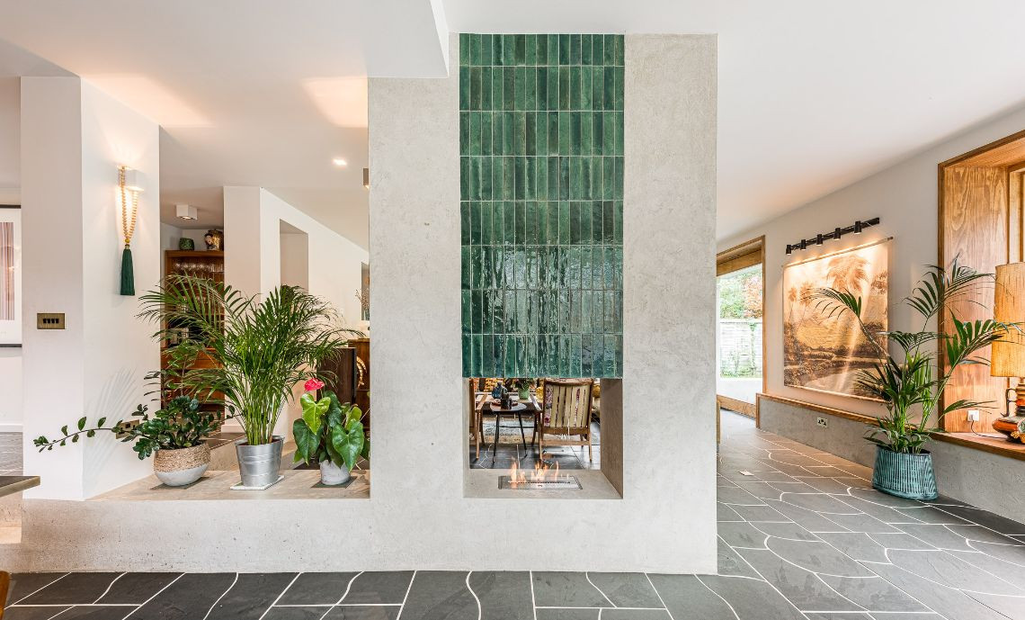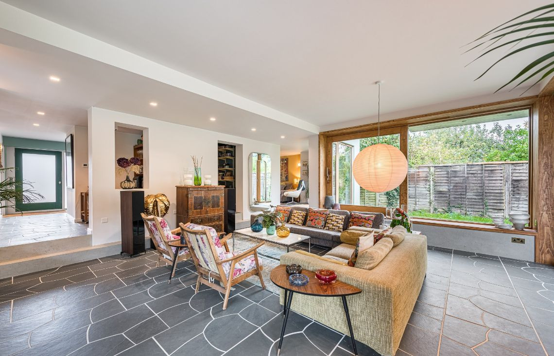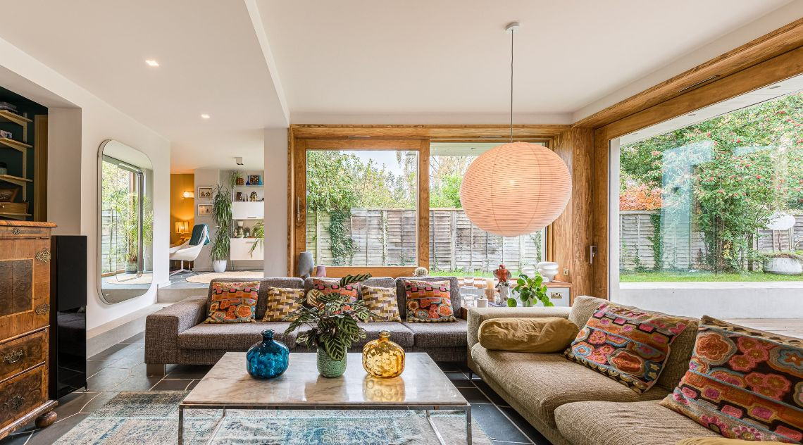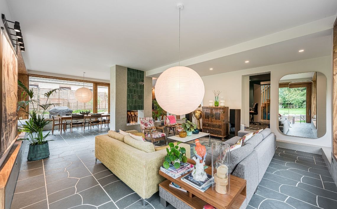 An architecturally designed home featuring Mid-Century Modern decor and open-plan living. It has high ceilings and lots of natural light.