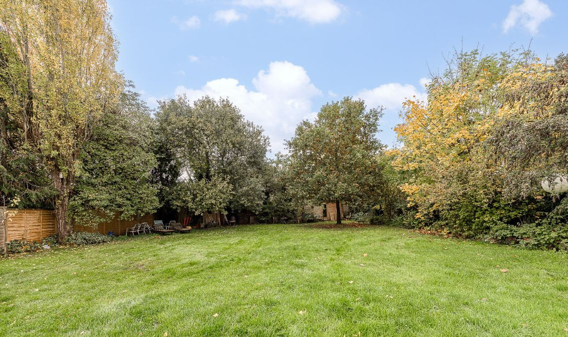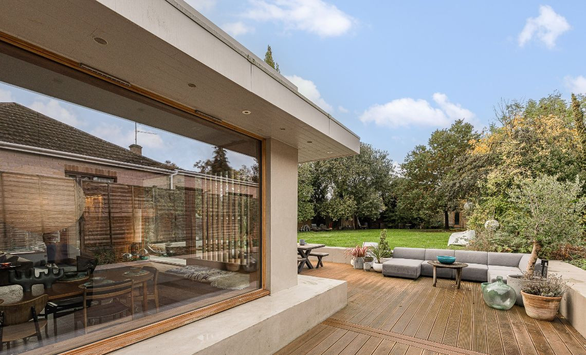 Large garden space with wooden terrace.