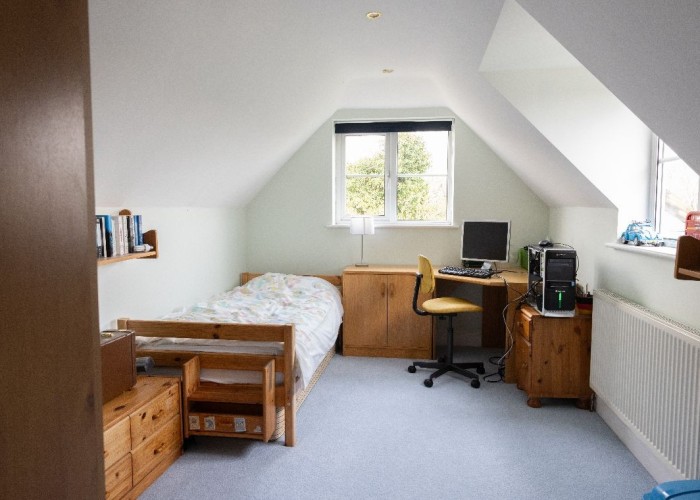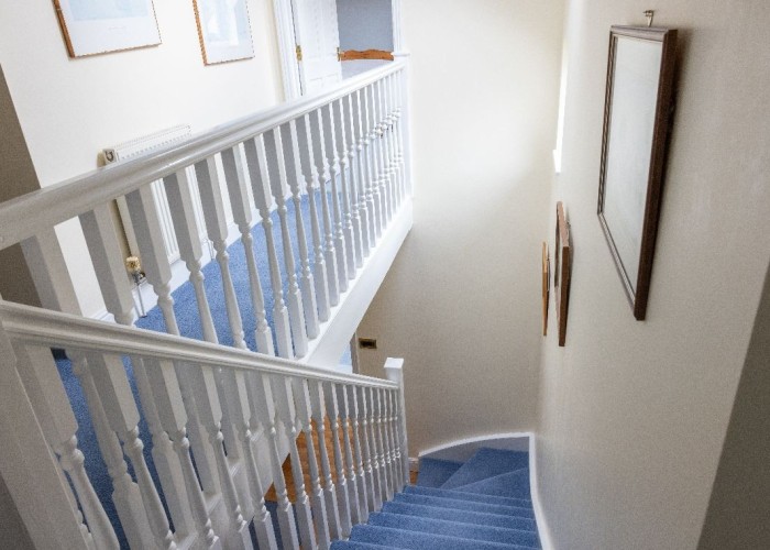It has 5 bedrooms, a downstairs toilet and 3 bathrooms upstairs. Two of the bedrooms are linked via an archway. Downstairs there is a living room, a second smaller living room in which we have a grand piano, a study, a conservatory, a kitchen and small utility room.