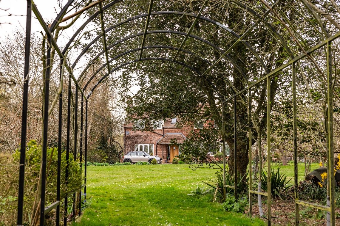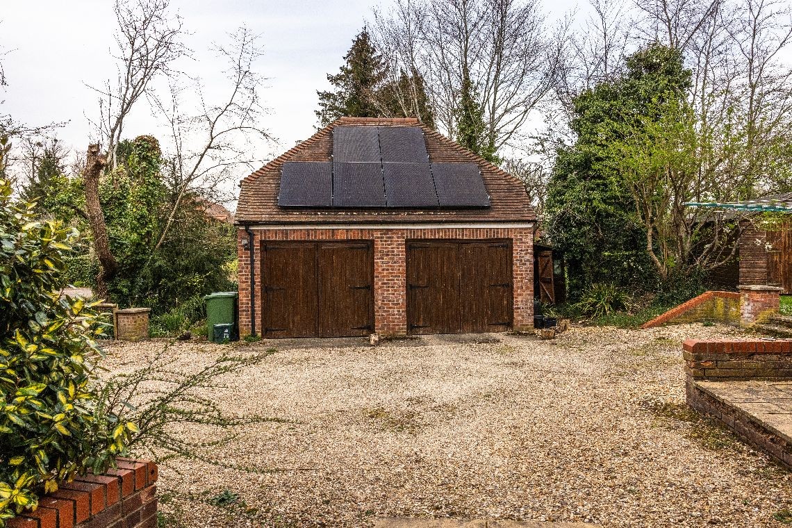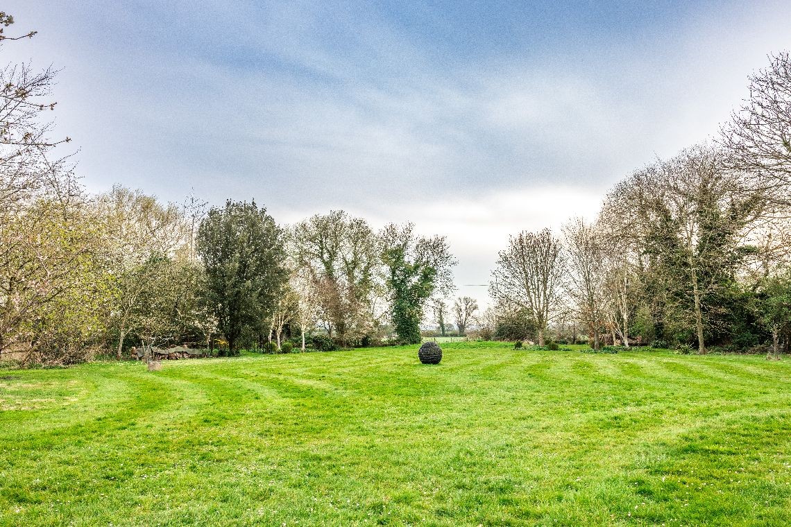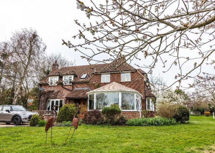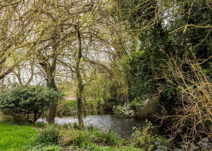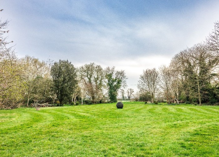 The house is on a one acre plot with open views at two sides. A stream and runs down two sides of the garden and opens into two ponds. There is parking at the front and back of the house and a freestanding double garage, a number of sheds and an odd greenhouse.