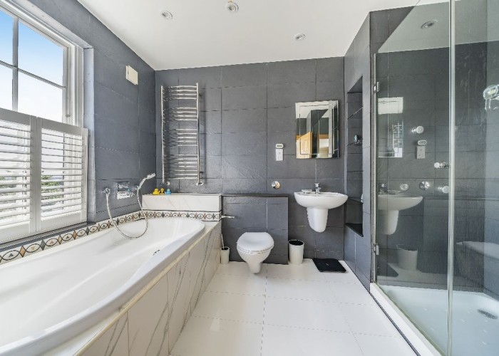Separate self-contained wing with private entrance. Impressive landscaped garden, treehouse, tennis court, orchard, and a swimming pool with retractable cover. Ample off-street parking behind electric gates.