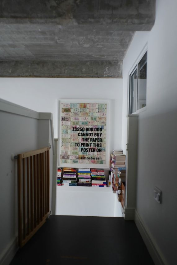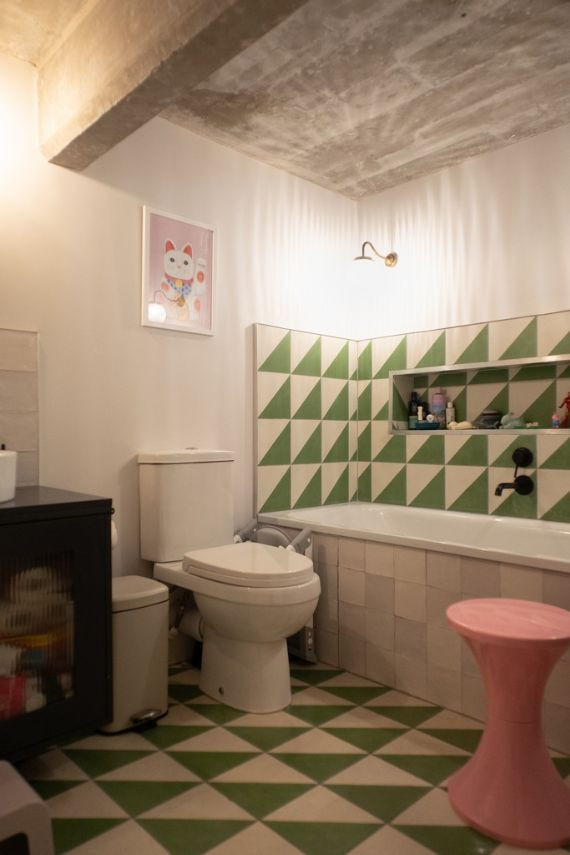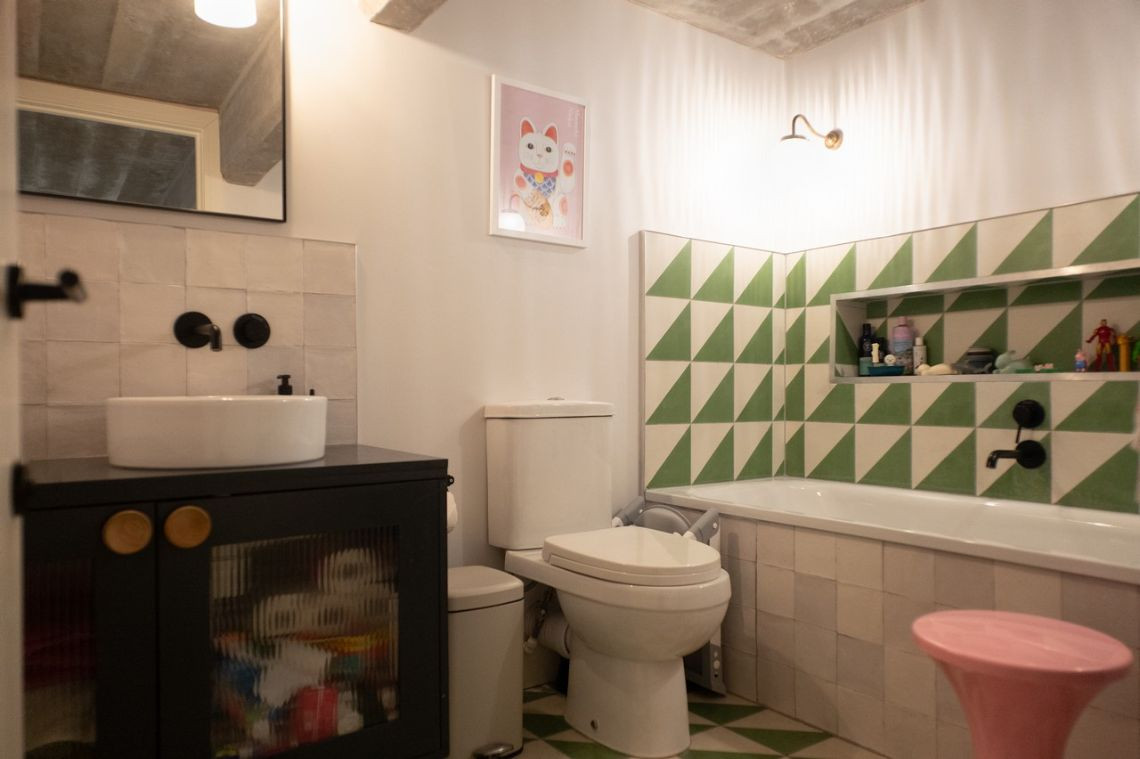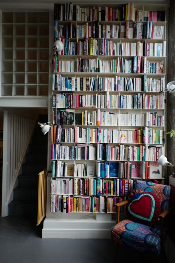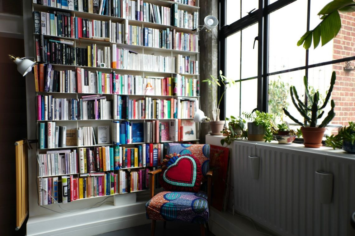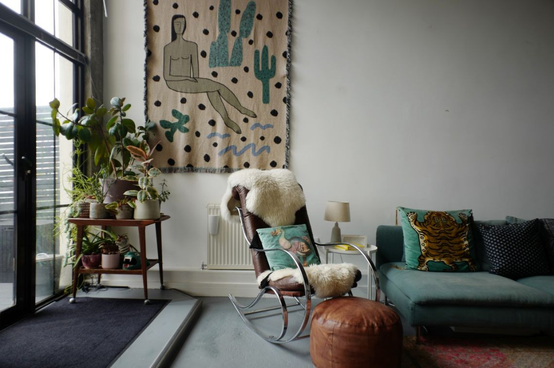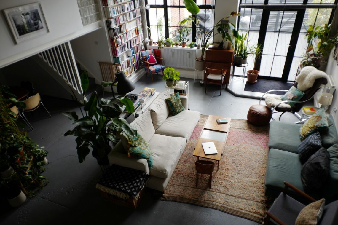 Bright and homely converted warehouse apartment with open plan living spaces. The living room area features floor to ceiling book shelf and colourful accents throughout the space. There are large indoor plants that help define each separate area. The home features three separate bedrooms, one being a small and quaint child's room. Another features two internal windows overlooking the living space. The kitchen has white units and is tucked away by the dining room.