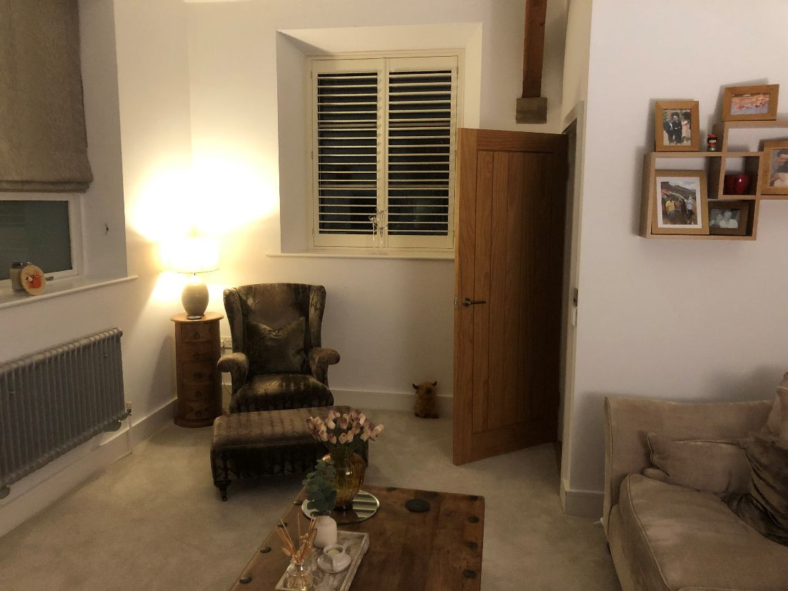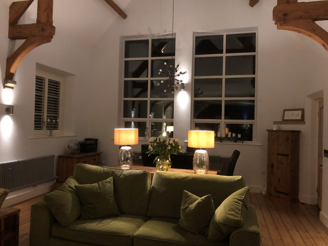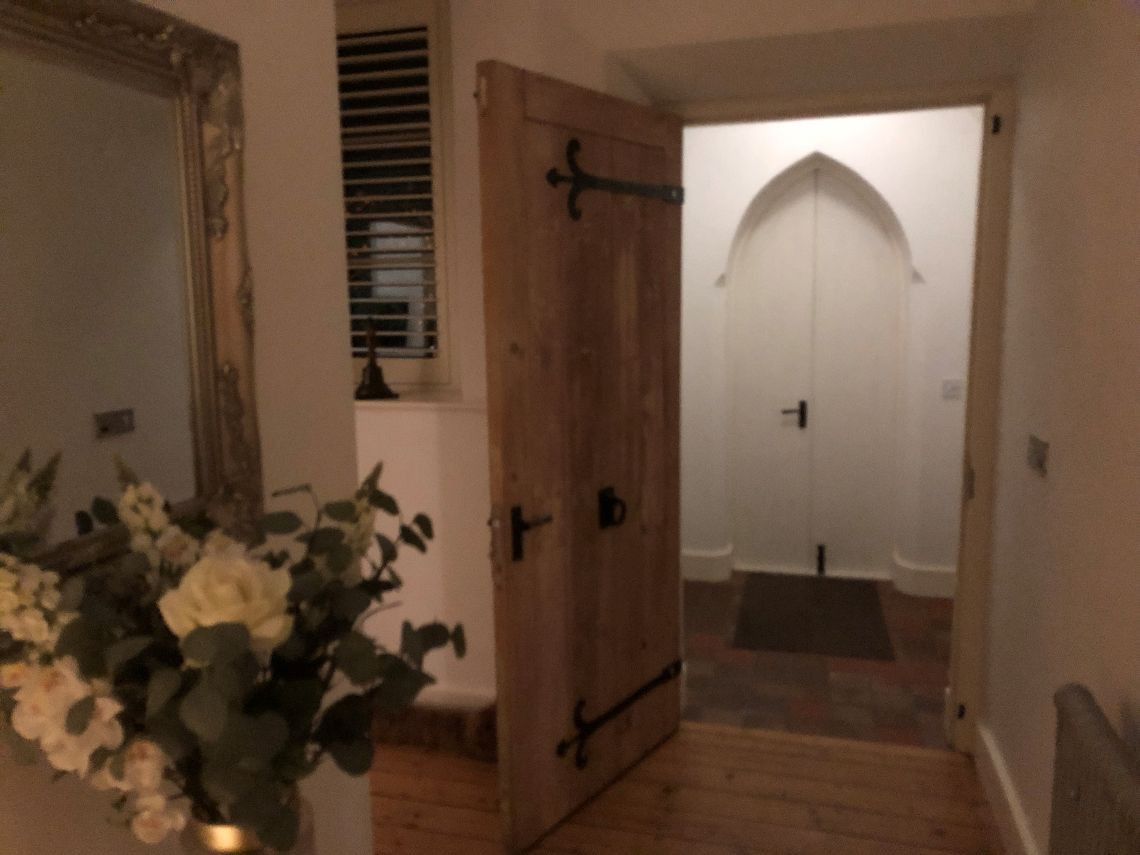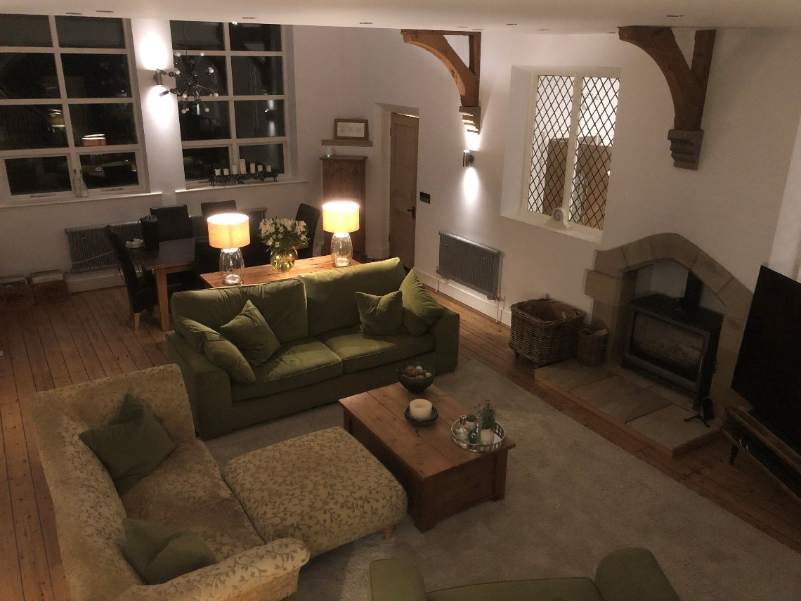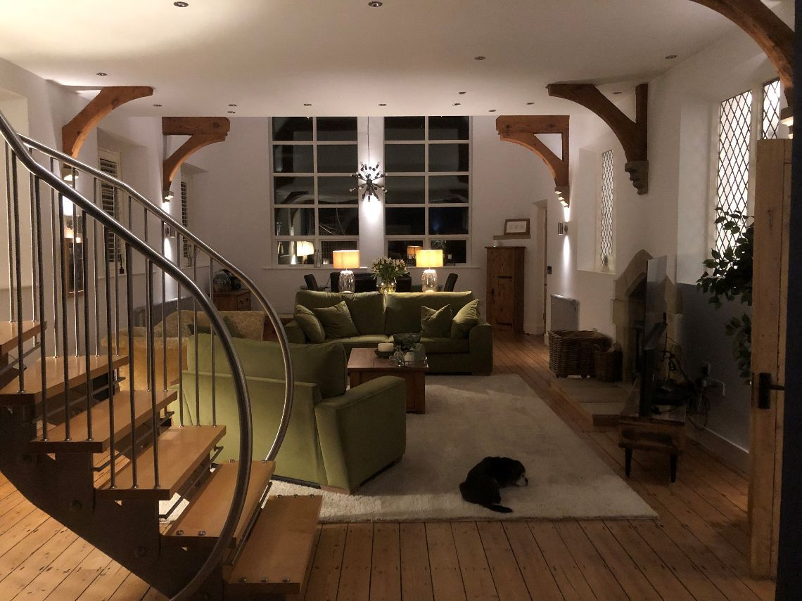 There are 3 large bedrooms built into a mezzanine floor which was created as part of the conversion, each with open beams. There are two lounges (one of which is the original classroom and is much larger than the other and with partial double height+ ceiling, large woodburning stove and bespoke staircase), again with open beams and a large kitchen. The house also has a utility room, office, and three small bathrooms.