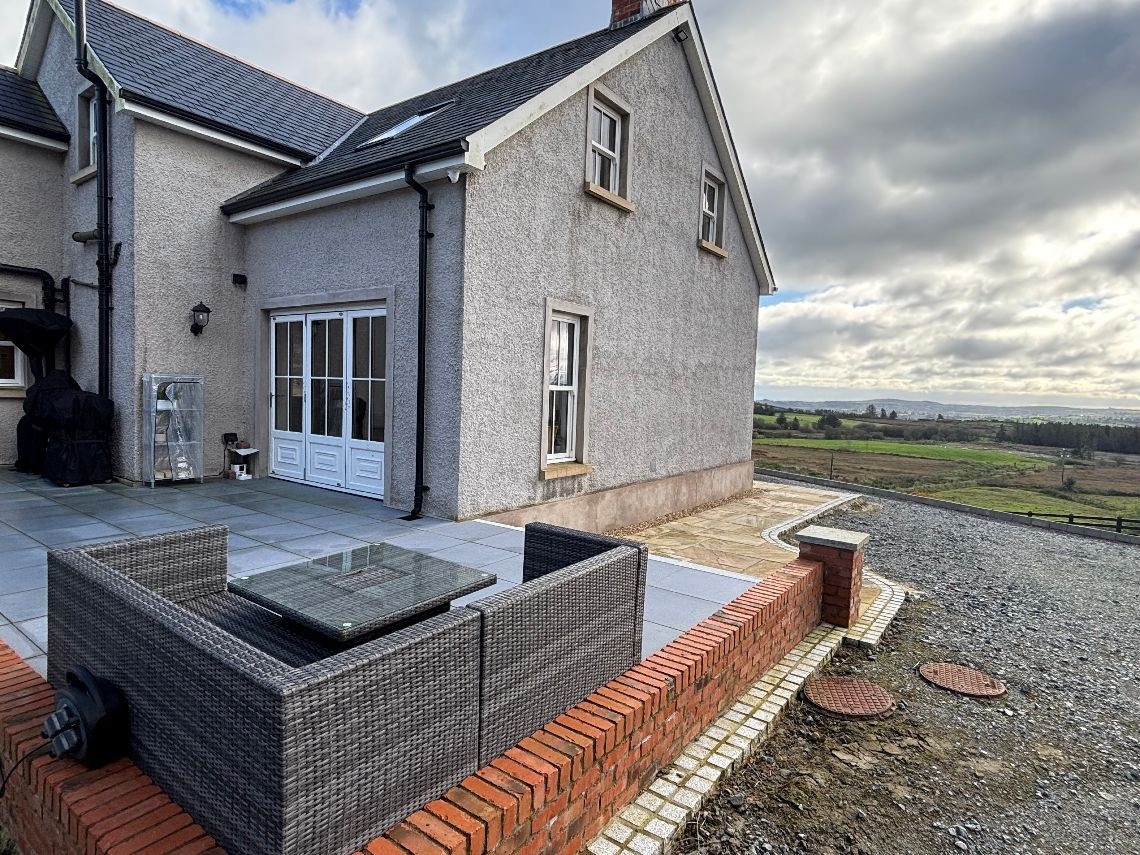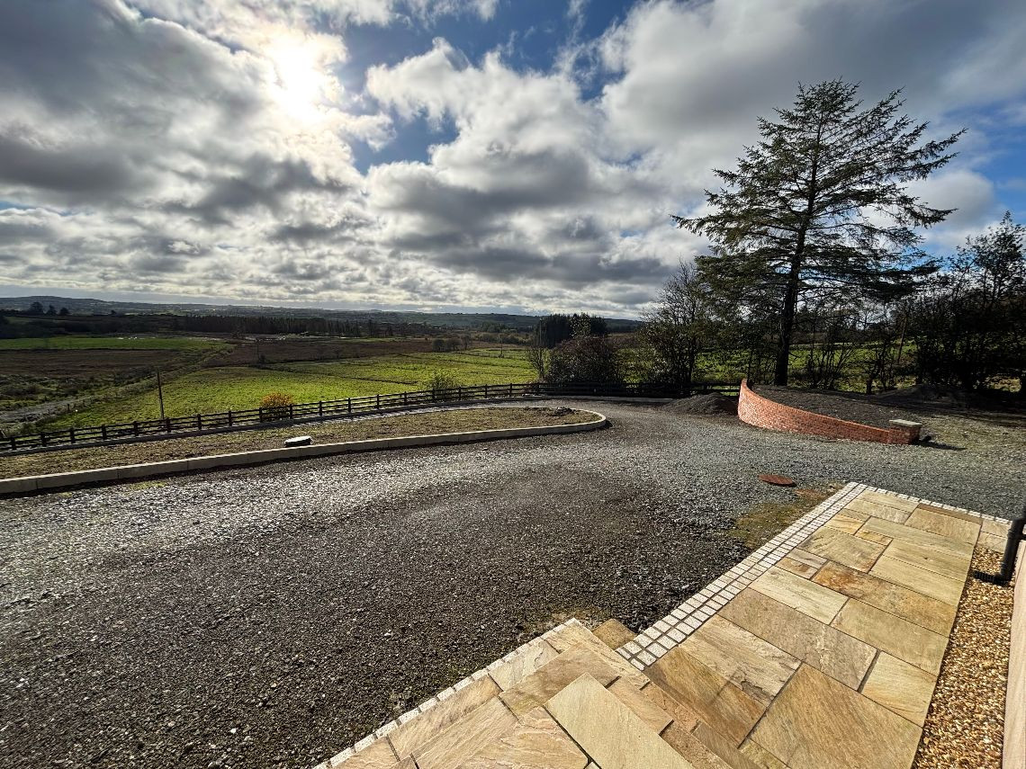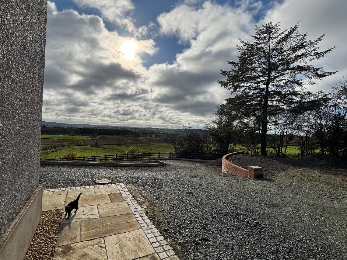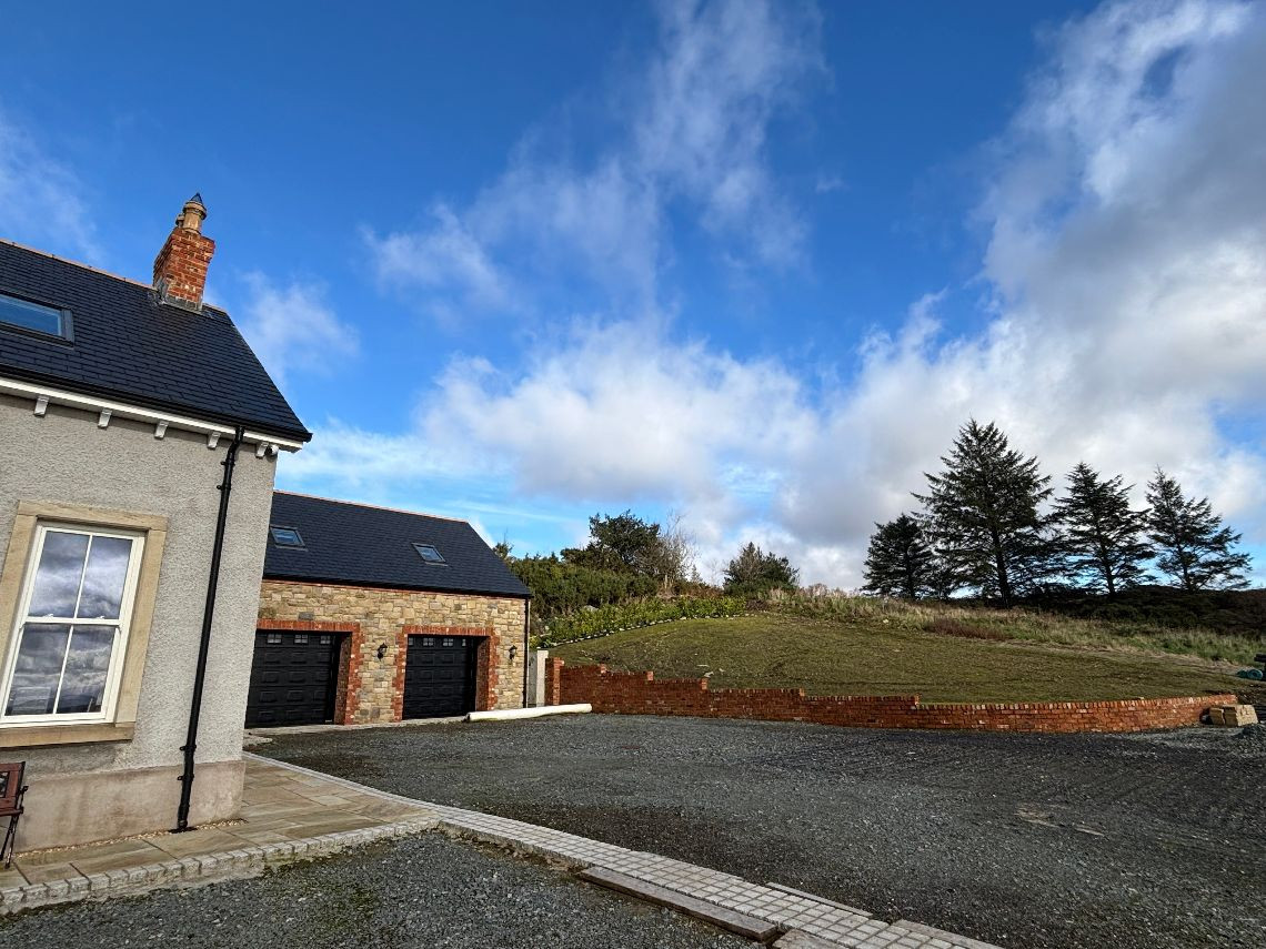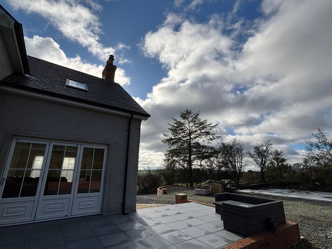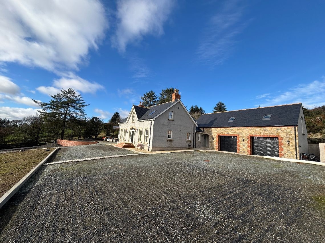 3200 square foot, 2 storey house, plus an attached double garage. Georgian inspired design with traditional features including sliding sash windows, natural sandstone walls and paving, reclaimed red brick, natural slate. 900 square foot ‘self-contained apartment’ above the garage (1 bedroom, 1 bathroom, open plan living - kitchen - dining). Note: these are the photos of the unfinished space. Set on 2 acres of elevated land in mountain region of Northern Ireland, surrounded by fields and forest with interrupted landscape views. External patio areas and paths.