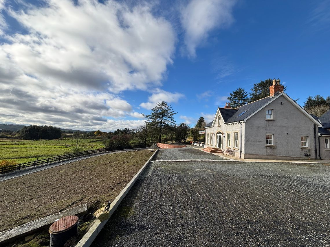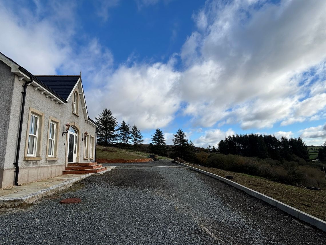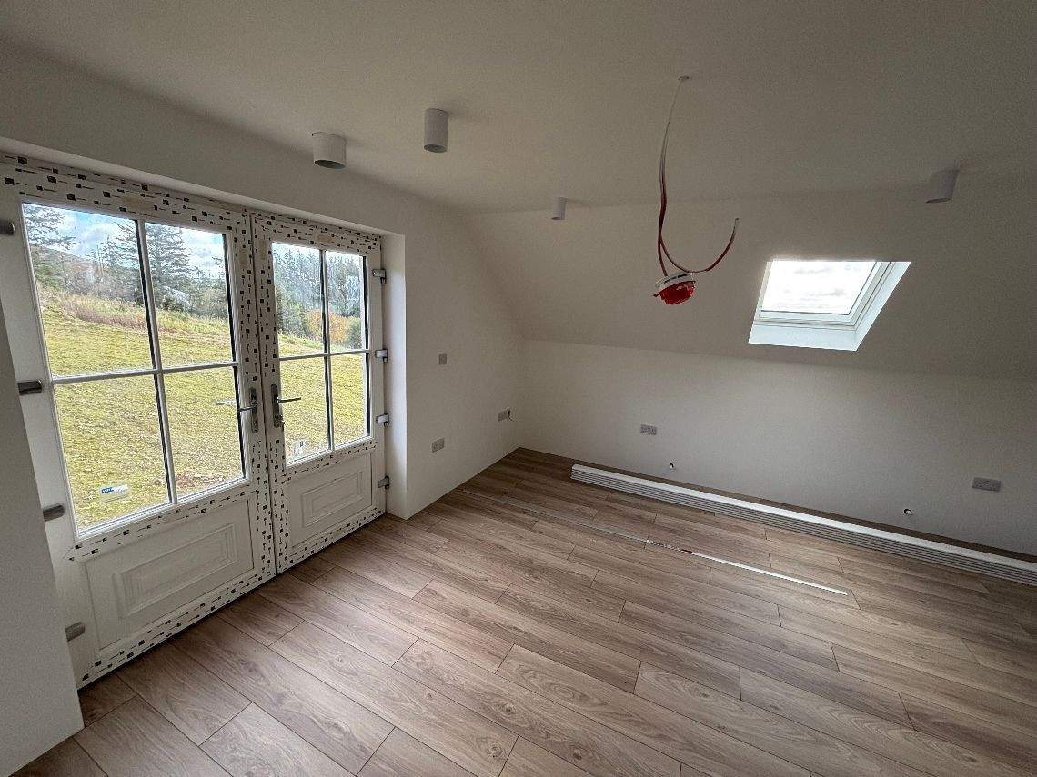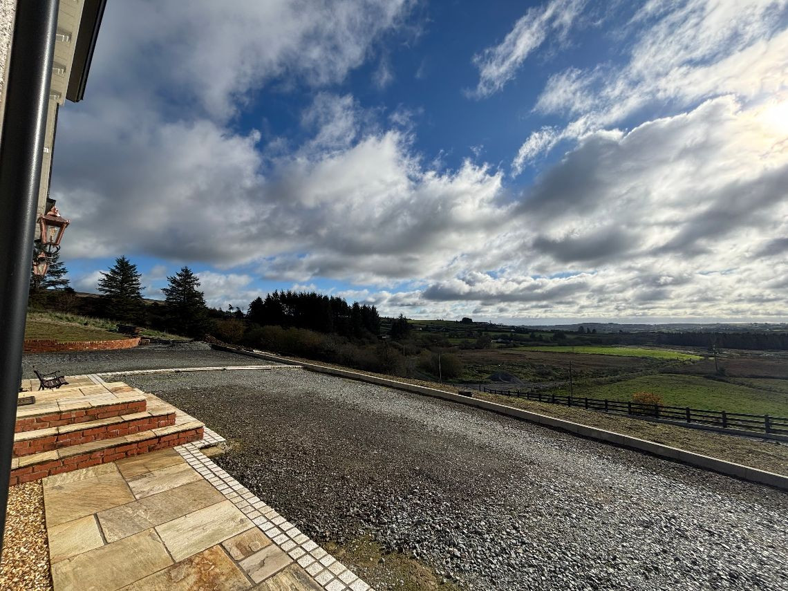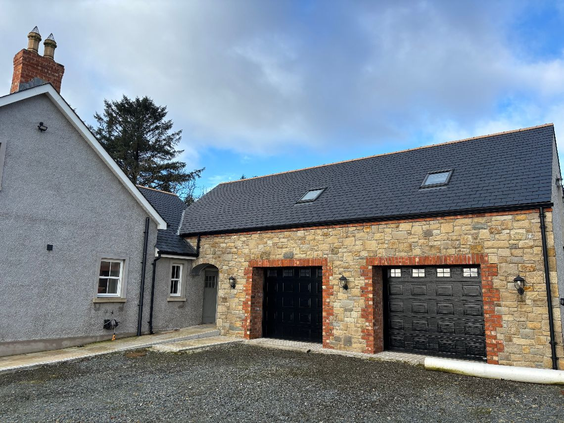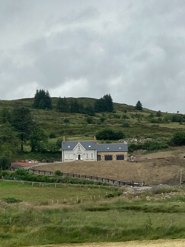 3200 square foot, 2 storey house, plus an attached double garage. Georgian inspired design with traditional features including sliding sash windows, natural sandstone walls and paving, reclaimed red brick, natural slate. 900 square foot ‘self-contained apartment’ above the garage (1 bedroom, 1 bathroom, open plan living - kitchen - dining). Note: these are the photos of the unfinished space. Set on 2 acres of elevated land in mountain region of Northern Ireland, surrounded by fields and forest with interrupted landscape views. External patio areas and paths.