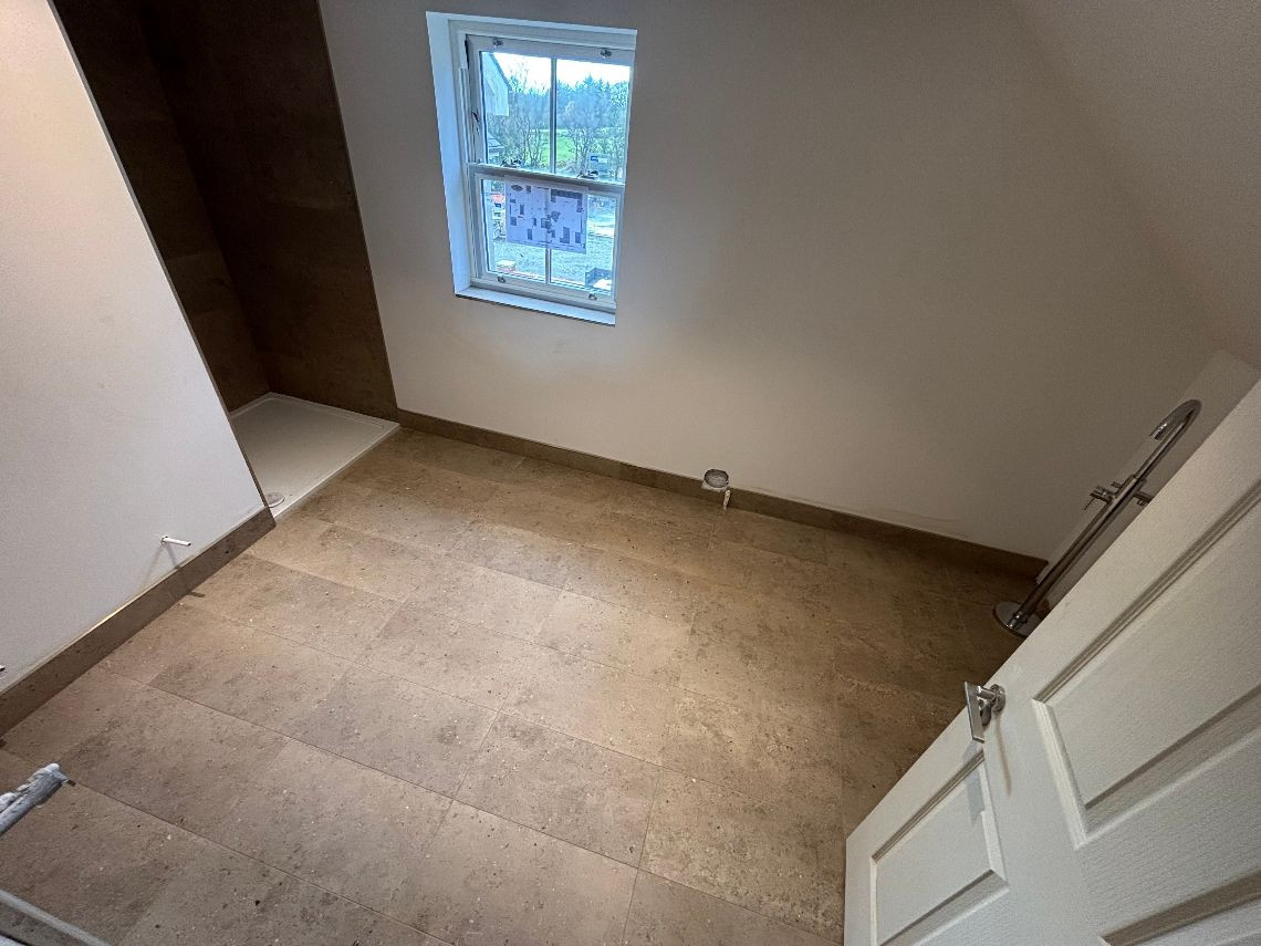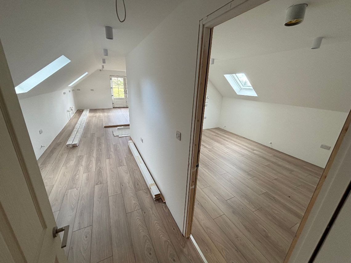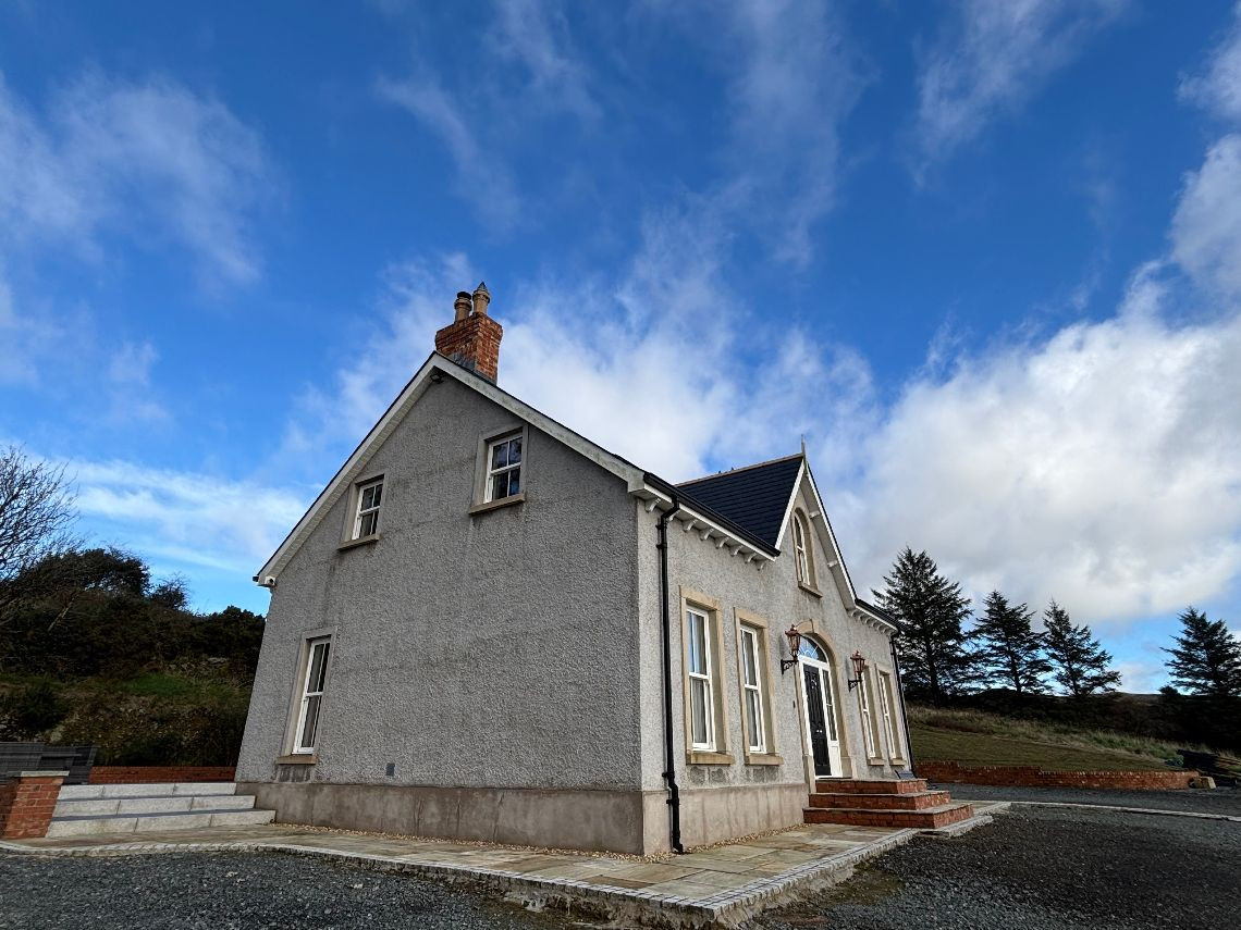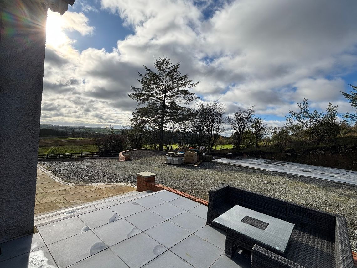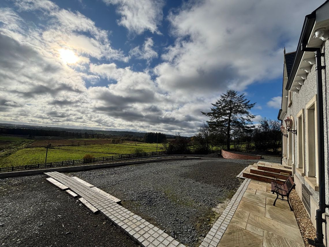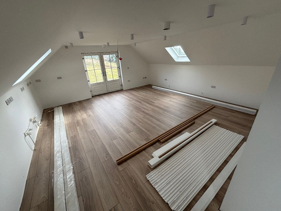 3200 square foot, 2 storey house, plus an attached double garage. Georgian inspired design with traditional features including sliding sash windows, natural sandstone walls and paving, reclaimed red brick, natural slate. 900 square foot ‘self-contained apartment’ above the garage (1 bedroom, 1 bathroom, open plan living - kitchen - dining). Note: these are the photos of the unfinished space. Set on 2 acres of elevated land in mountain region of Northern Ireland, surrounded by fields and forest with interrupted landscape views. External patio areas and paths.