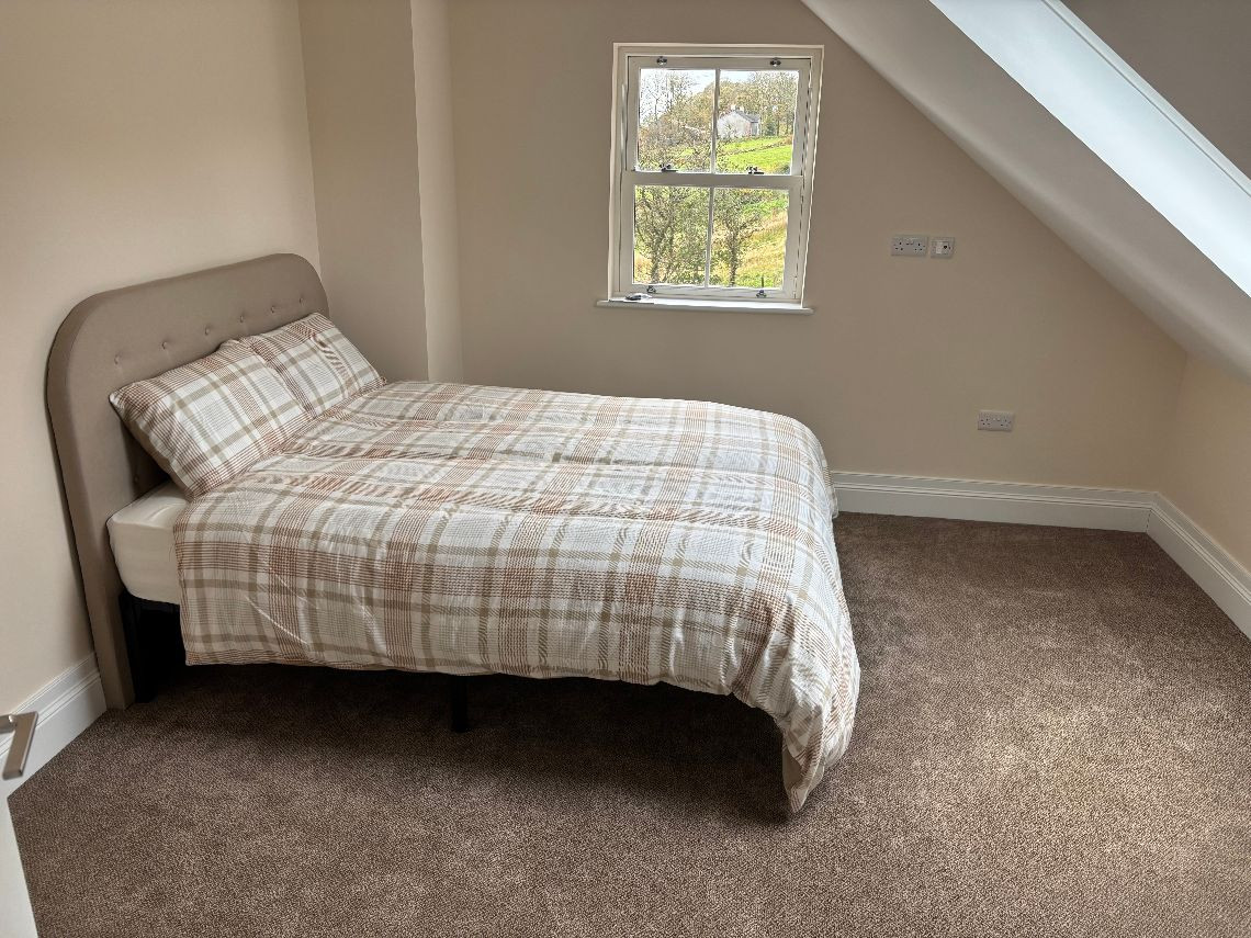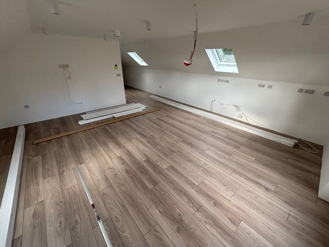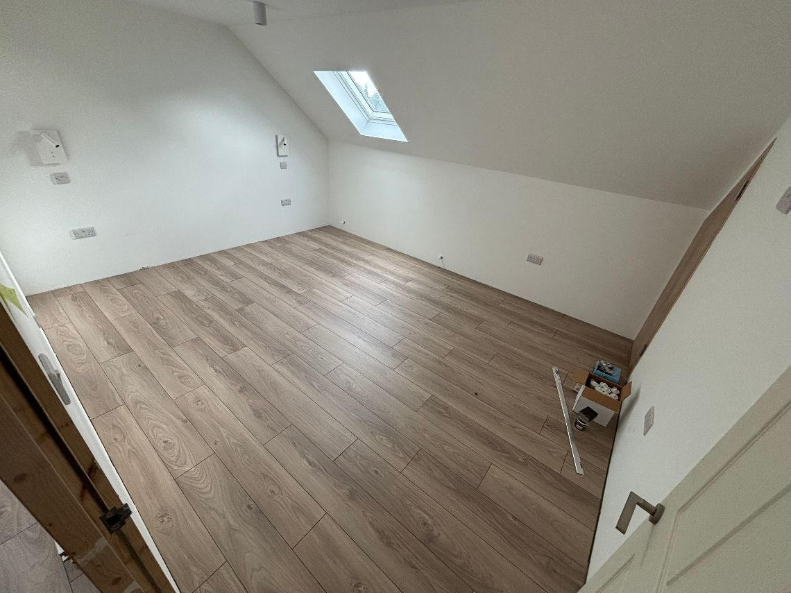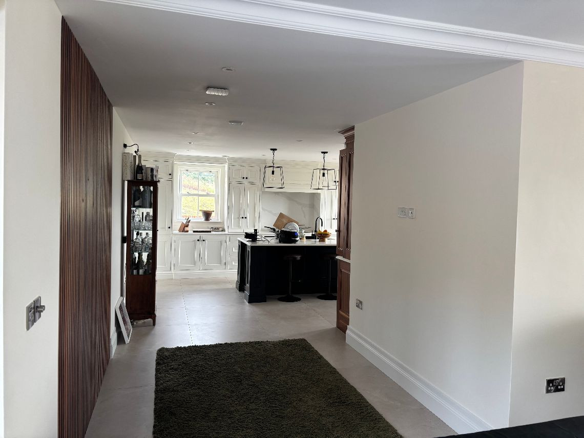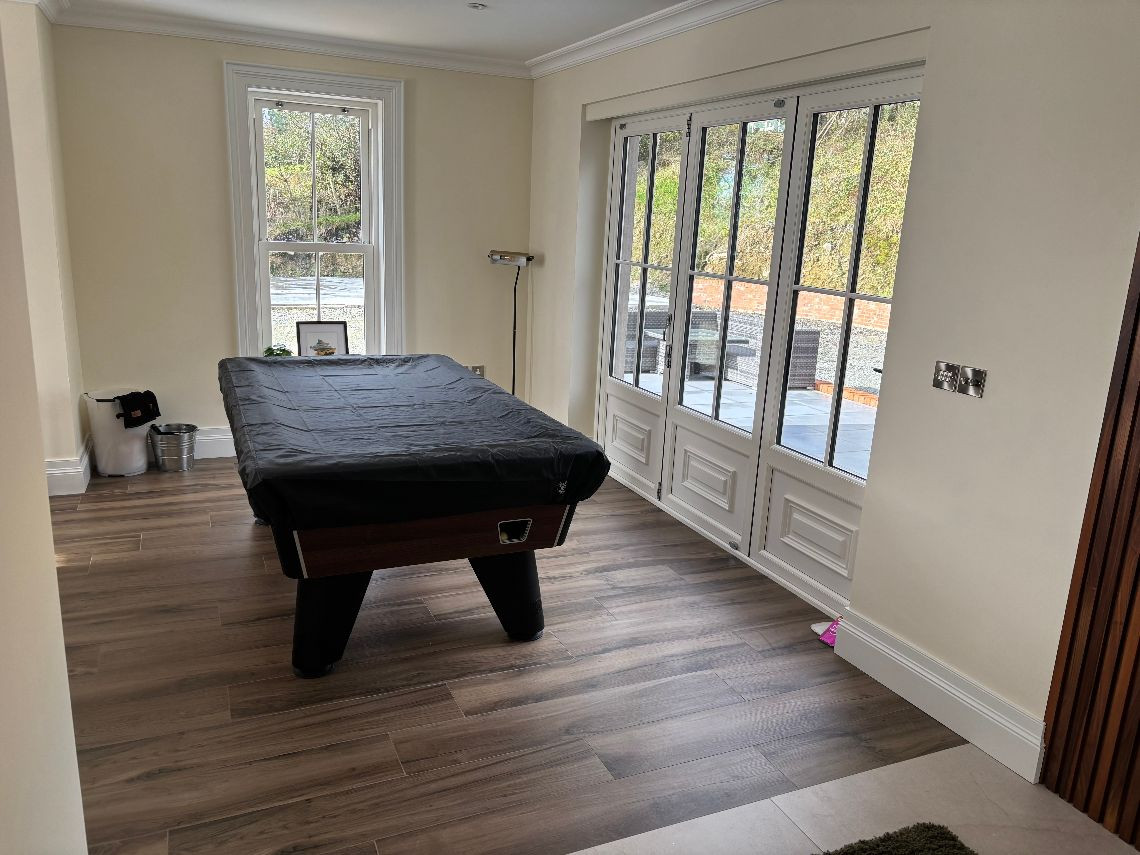 3200 square foot, 2 storey house, plus an attached double garage. Georgian inspired design with traditional features including sliding sash windows, natural sandstone walls and paving, reclaimed red brick, natural slate. 900 square foot ‘self-contained apartment’ above the garage (1 bedroom, 1 bathroom, open plan living - kitchen - dining). Note: these are the photos of the unfinished space. Set on 2 acres of elevated land in mountain region of Northern Ireland, surrounded by fields and forest with interrupted landscape views. External patio areas and paths.