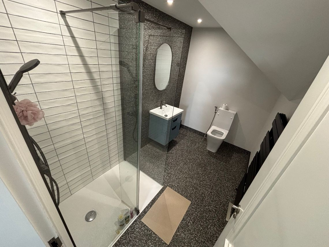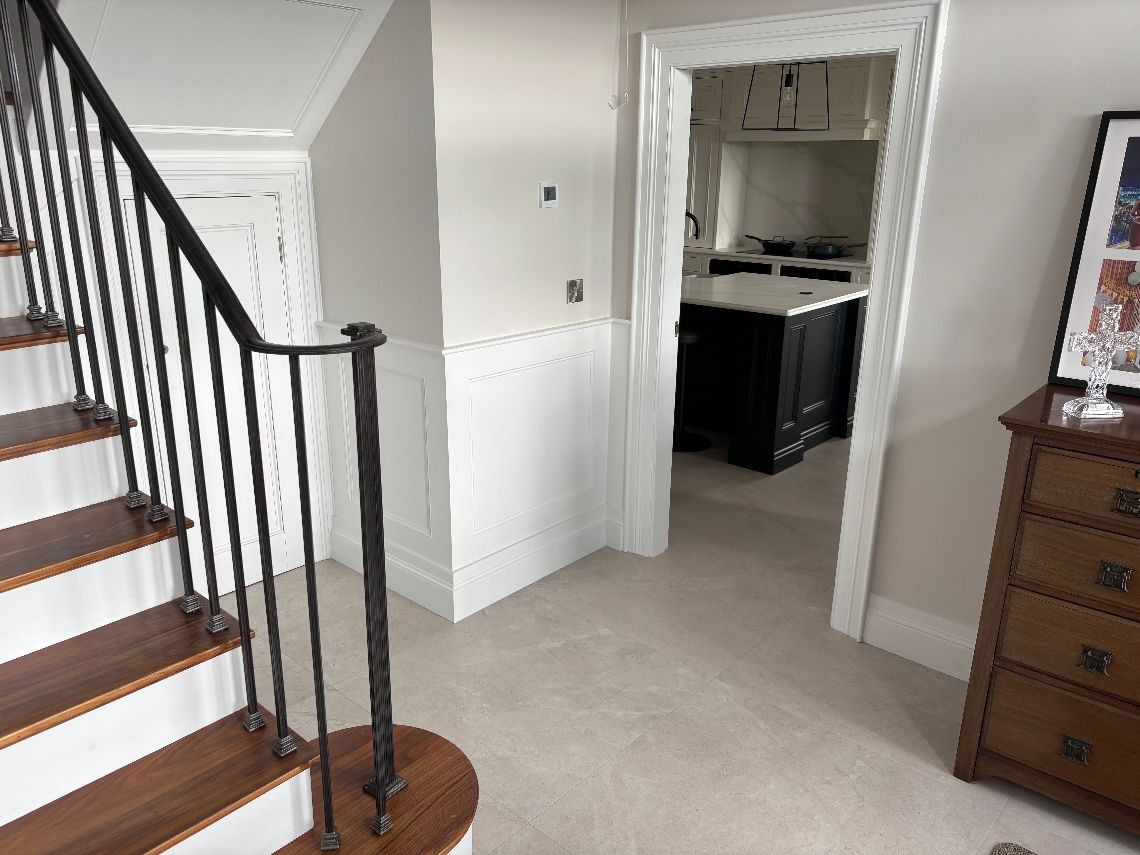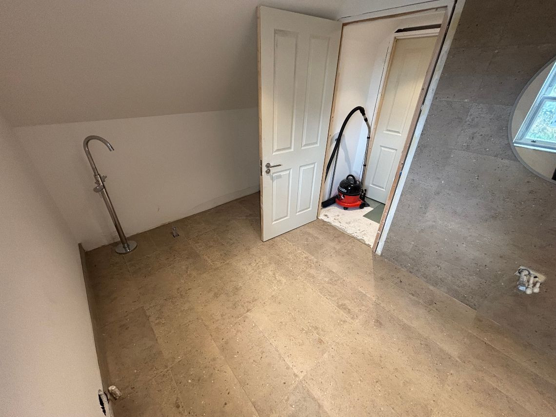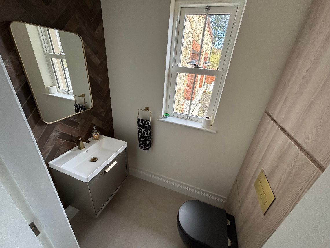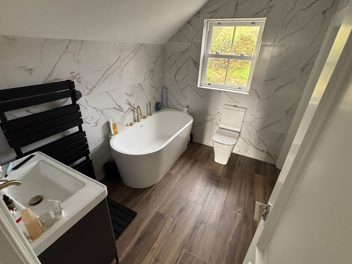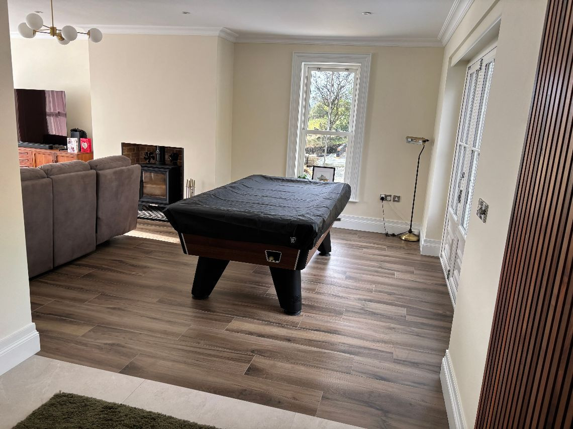 3200 square foot, 2 storey house, plus an attached double garage. Georgian inspired design with traditional features including sliding sash windows, natural sandstone walls and paving, reclaimed red brick, natural slate. 900 square foot ‘self-contained apartment’ above the garage (1 bedroom, 1 bathroom, open plan living - kitchen - dining). Note: these are the photos of the unfinished space. Set on 2 acres of elevated land in mountain region of Northern Ireland, surrounded by fields and forest with interrupted landscape views. External patio areas and paths.