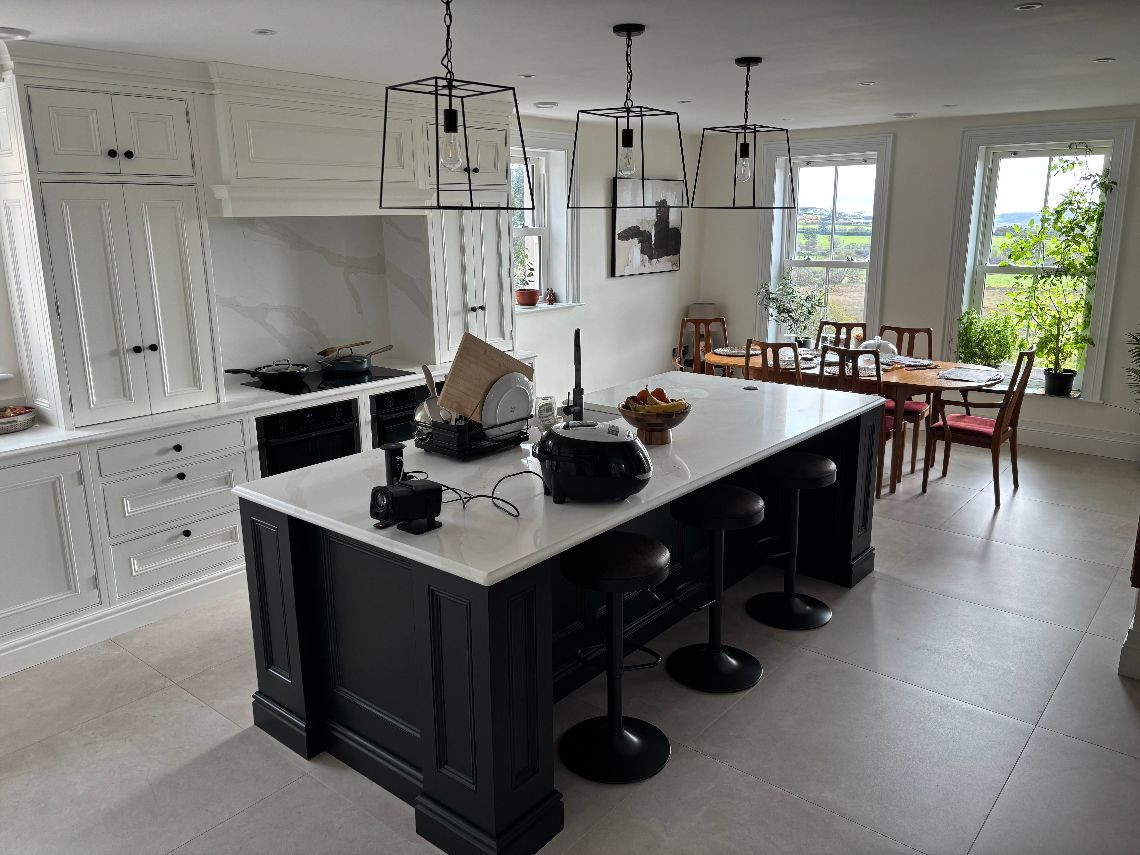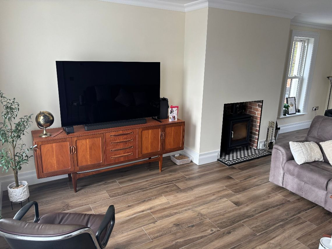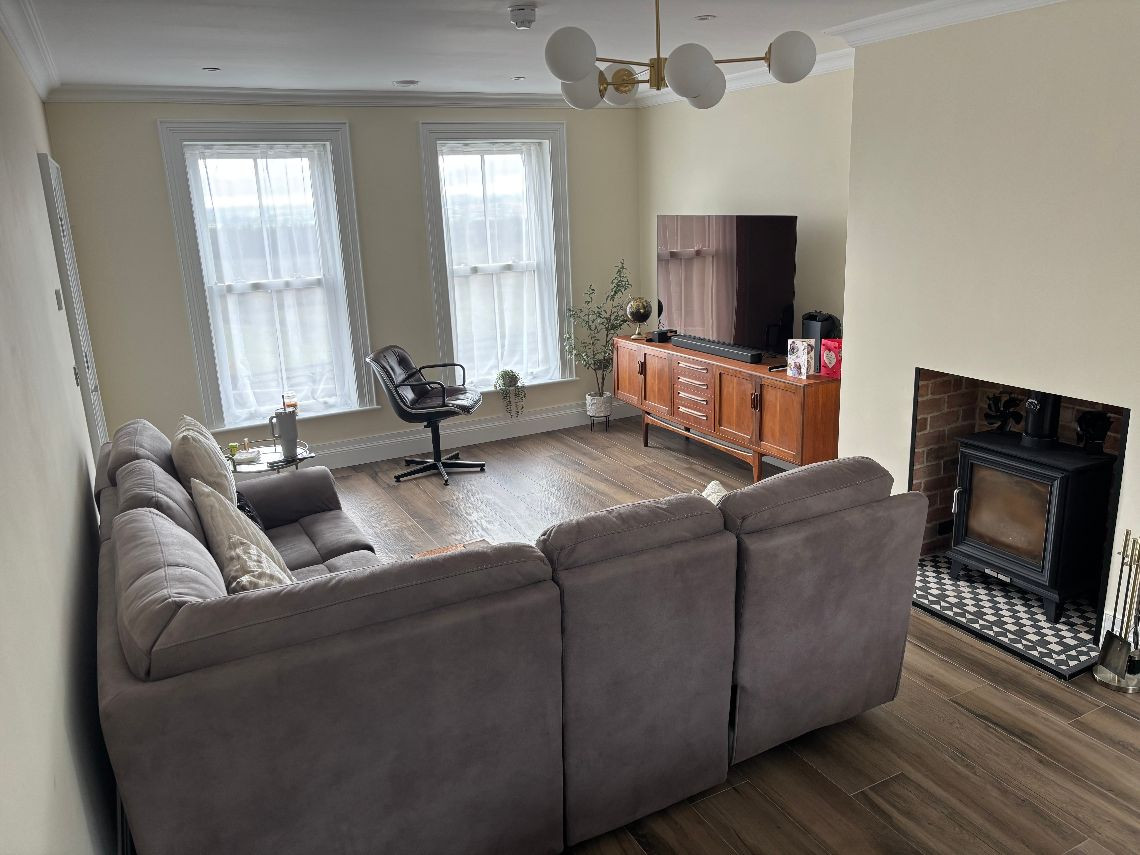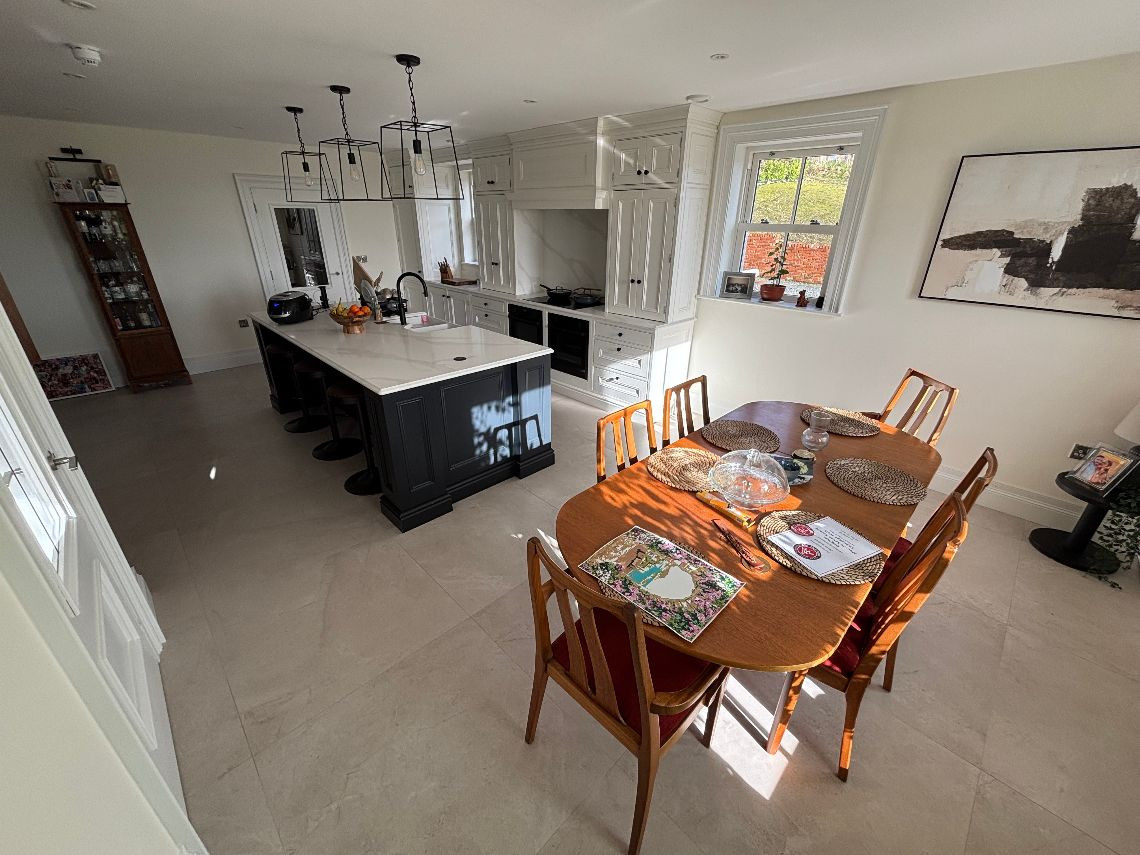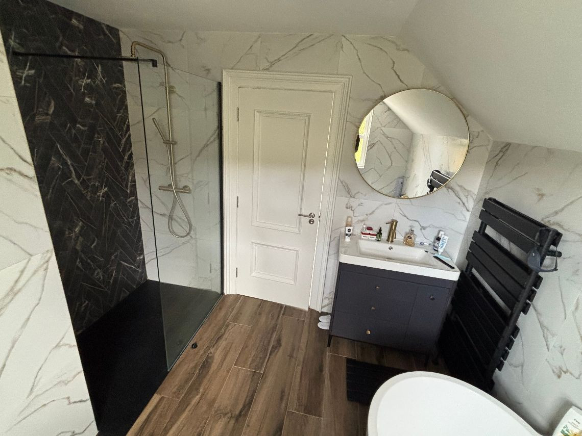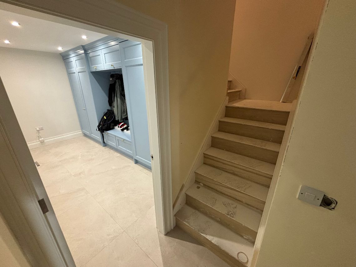3200 square foot, 2 storey house, plus an attached double garage. Georgian inspired design with traditional features including sliding sash windows, natural sandstone walls and paving, reclaimed red brick, natural slate. 900 square foot ‘self-contained apartment’ above the garage (1 bedroom, 1 bathroom, open plan living - kitchen - dining). Note: these are the photos of the unfinished space. Set on 2 acres of elevated land in mountain region of Northern Ireland, surrounded by fields and forest with interrupted landscape views. External patio areas and paths.