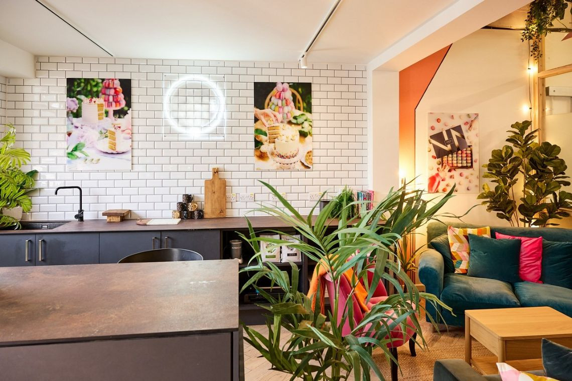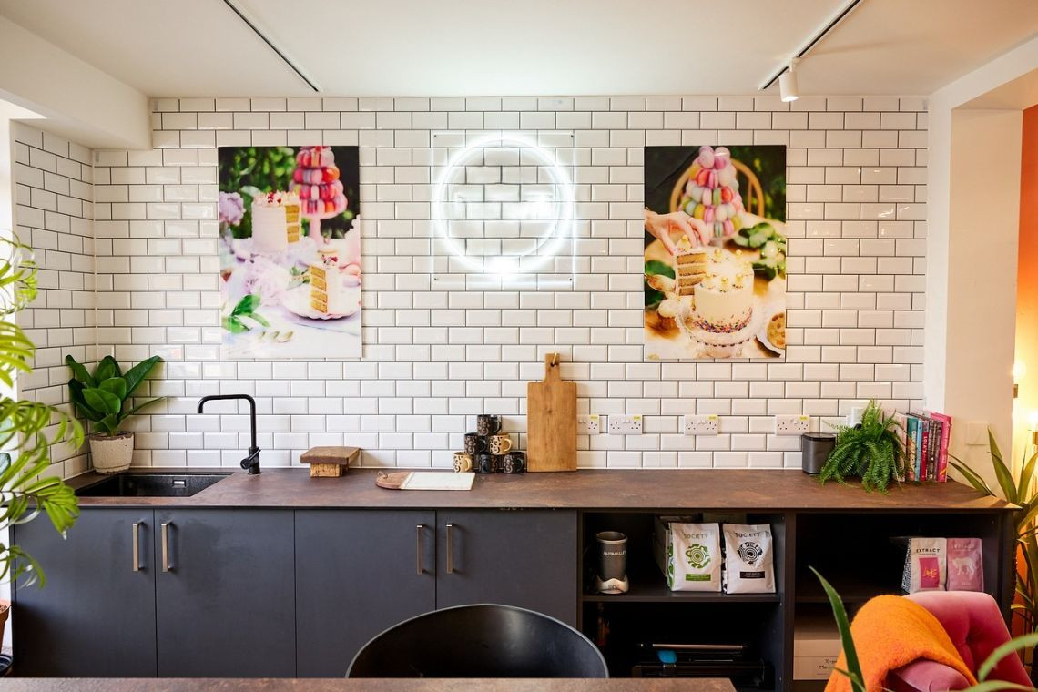 This is a bright, design-led industrial bakery studio combining a fully equipped professional kitchen with a warm, styled lounge space. This is a fully operational working kitchen. Full space hire is available, and individual kitchen stations can also be hired.