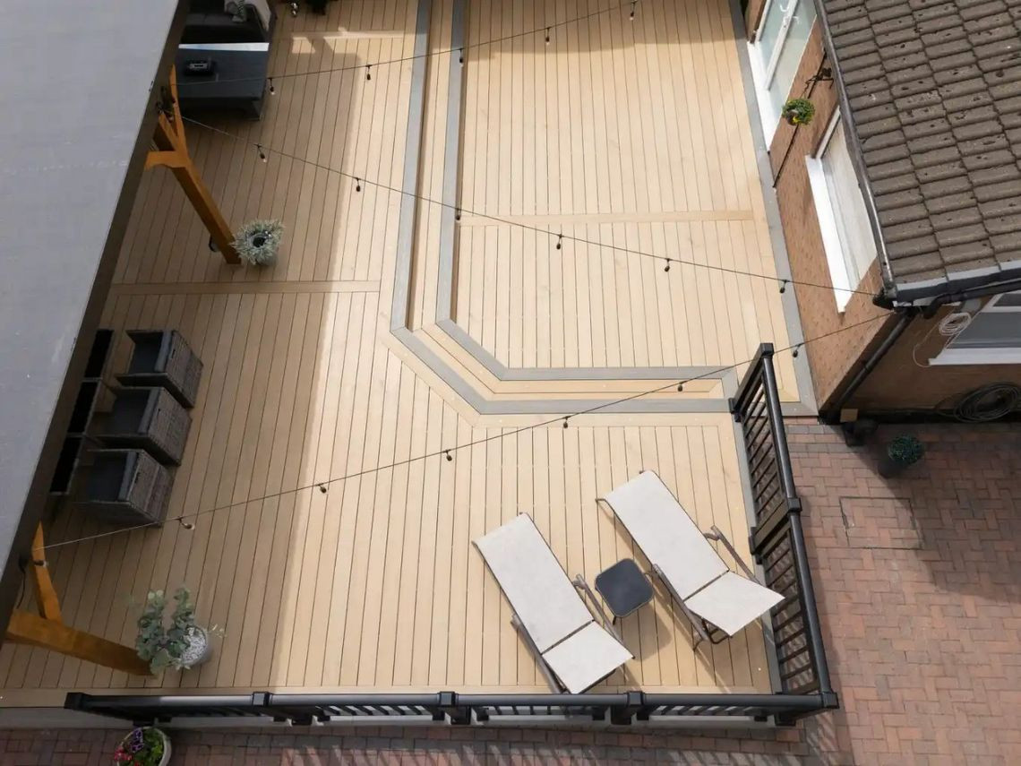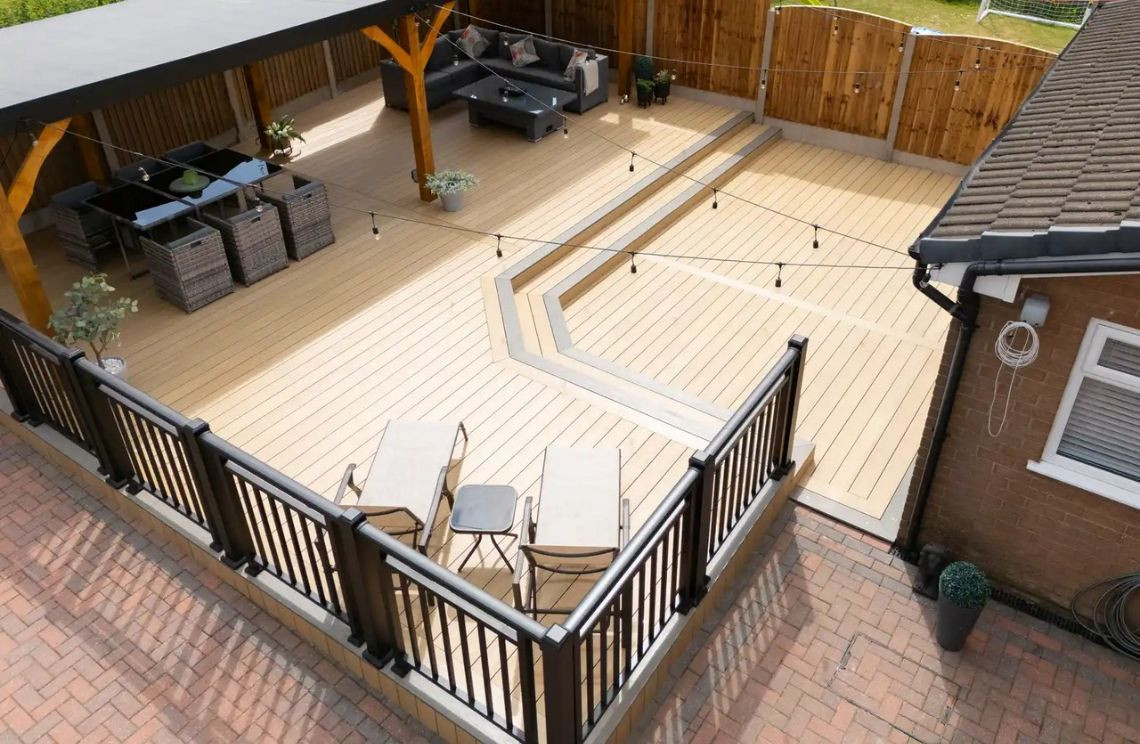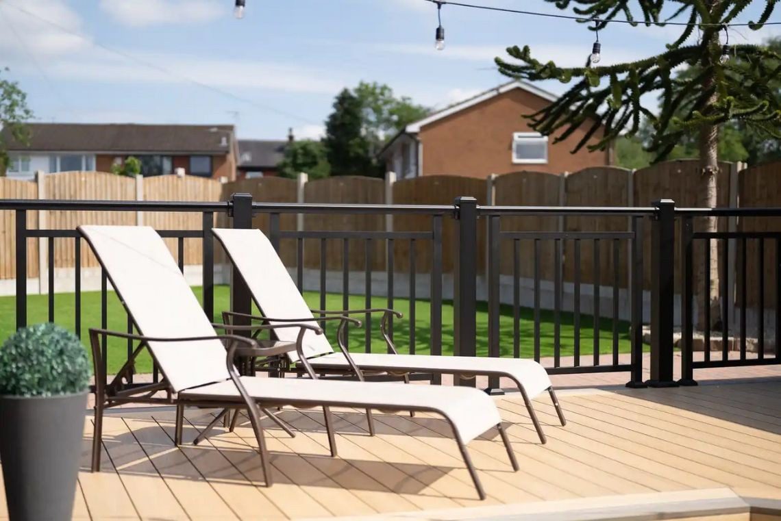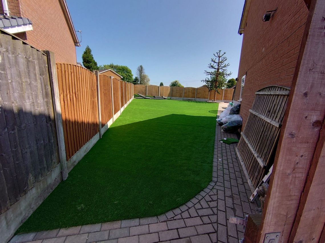 The garden has a raised deck with several seating and dining areas. A section of this deck is covered by a pergola. There is also a large Astro turf lawn that stretches down the side of the home. A large driveway at the front offers off street parking and filming opportunities.