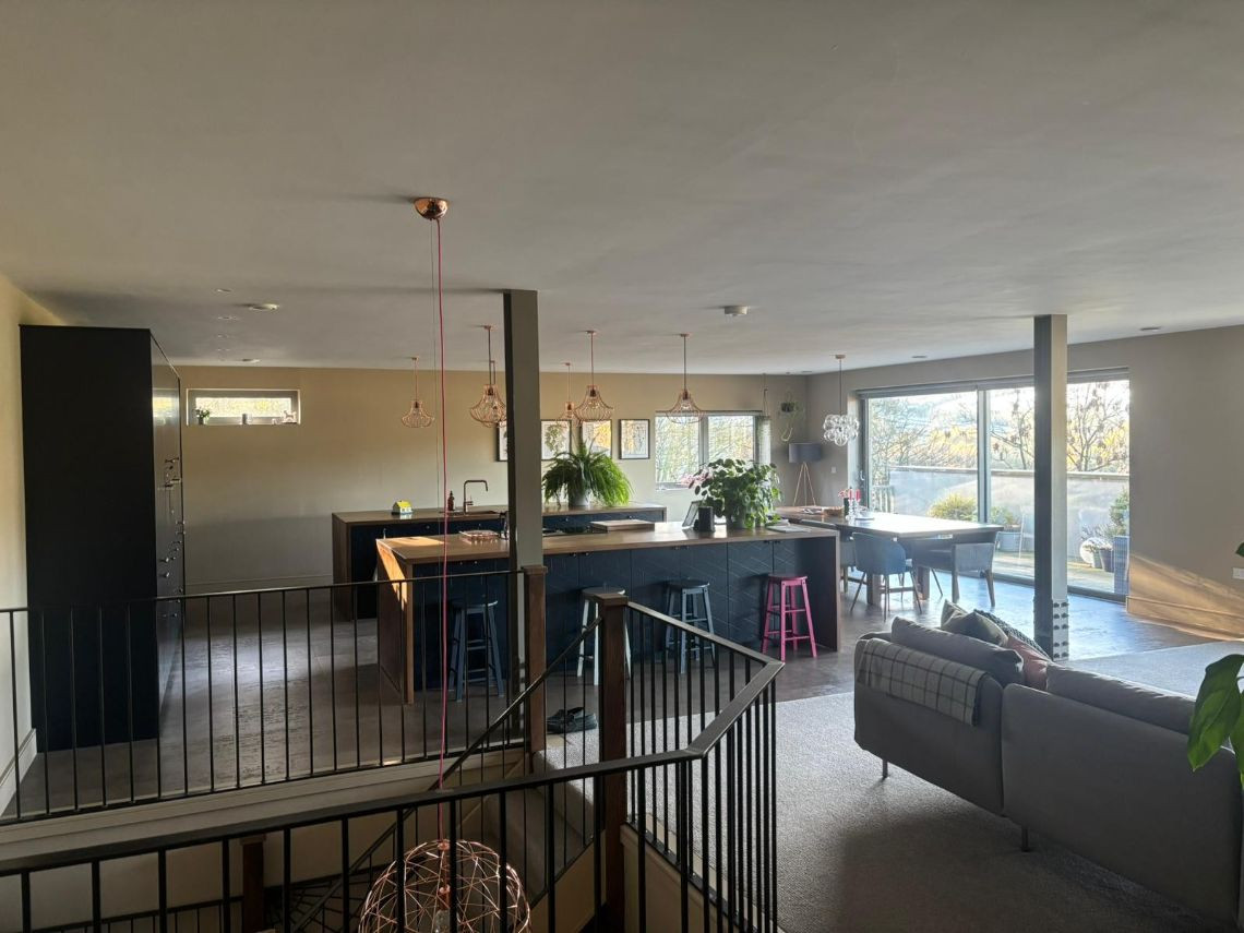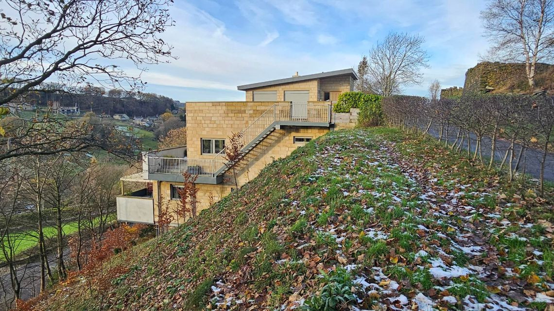 A recent self build house built into a hillside with excellent views of the countryside set in an acre of land