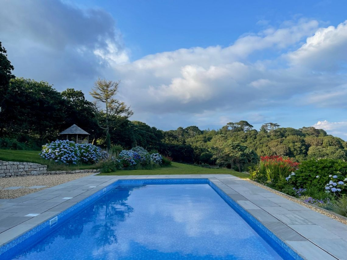 The house is surrounded by countryside, with fields and trees in abundance. There is a large outdoor swimming pool with a tiled area around it. From here there are views out to the sea.