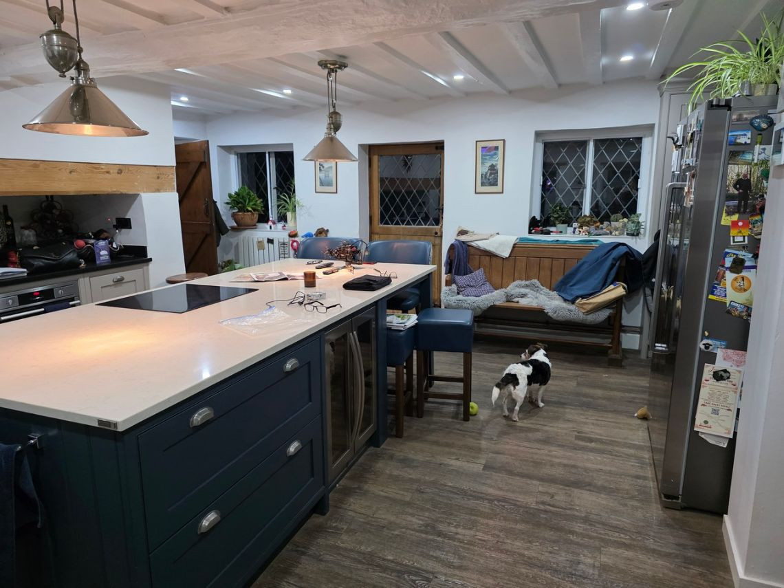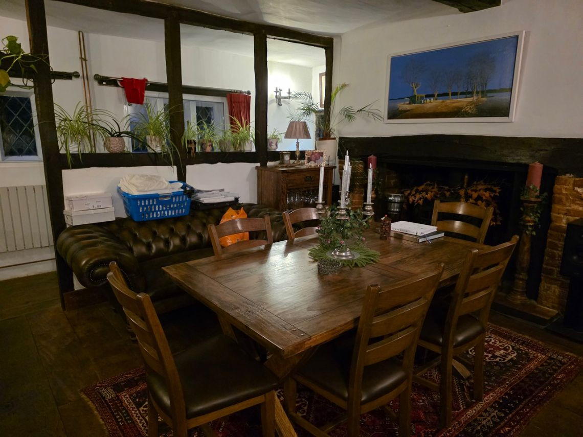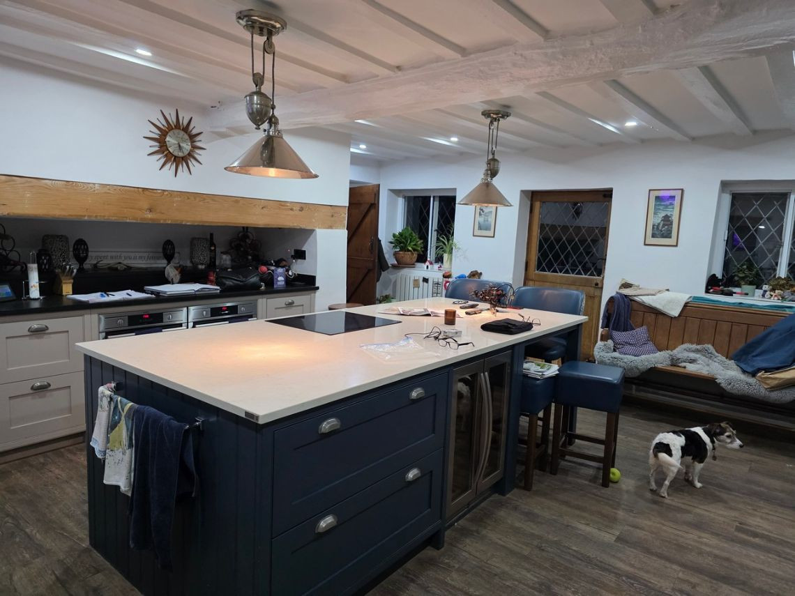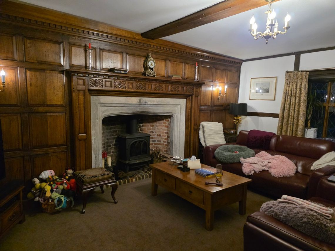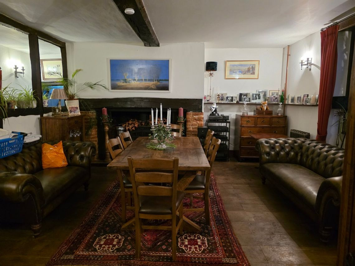 This period home from the 1600's features five bedrooms upstairs. Downstairs There is a large kitchen with an island and a mixture of dark blue and grey units. There is a double oven in the space where the fireplace would have been. The living room features a very large fireplace and oak walls. The dining room has a semi open plan feel and exposed beams. There is also a workout room.