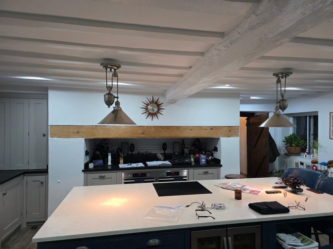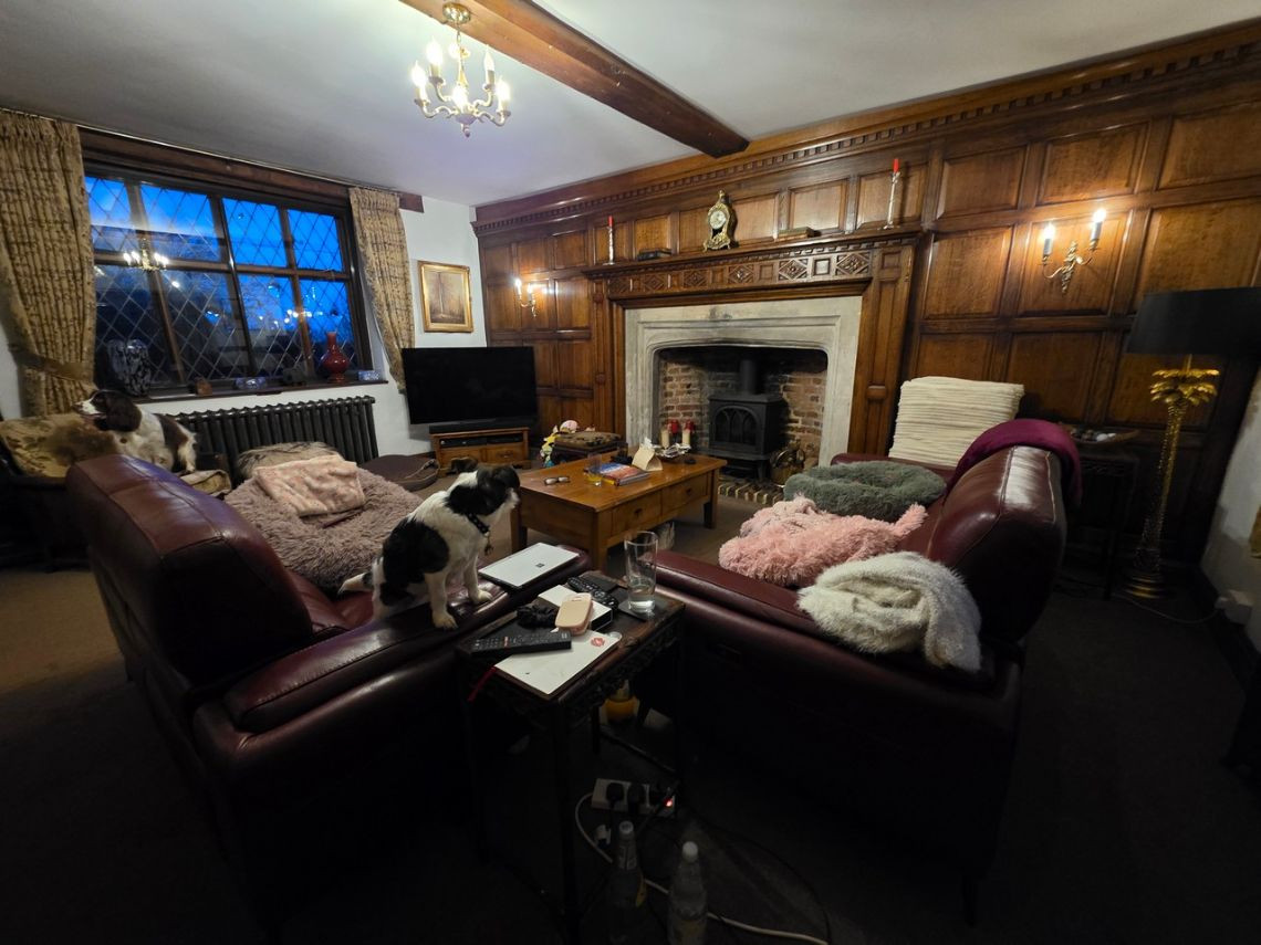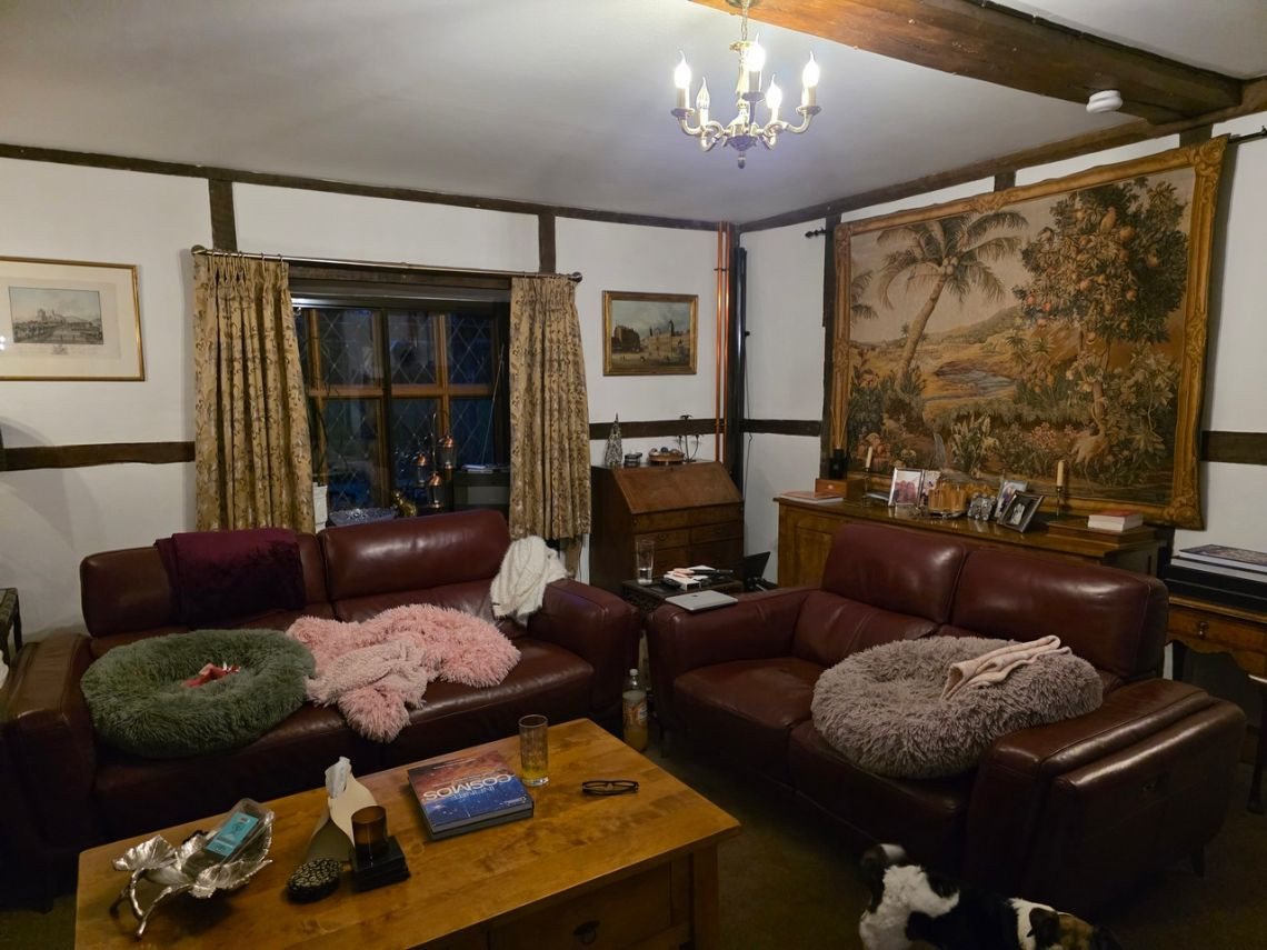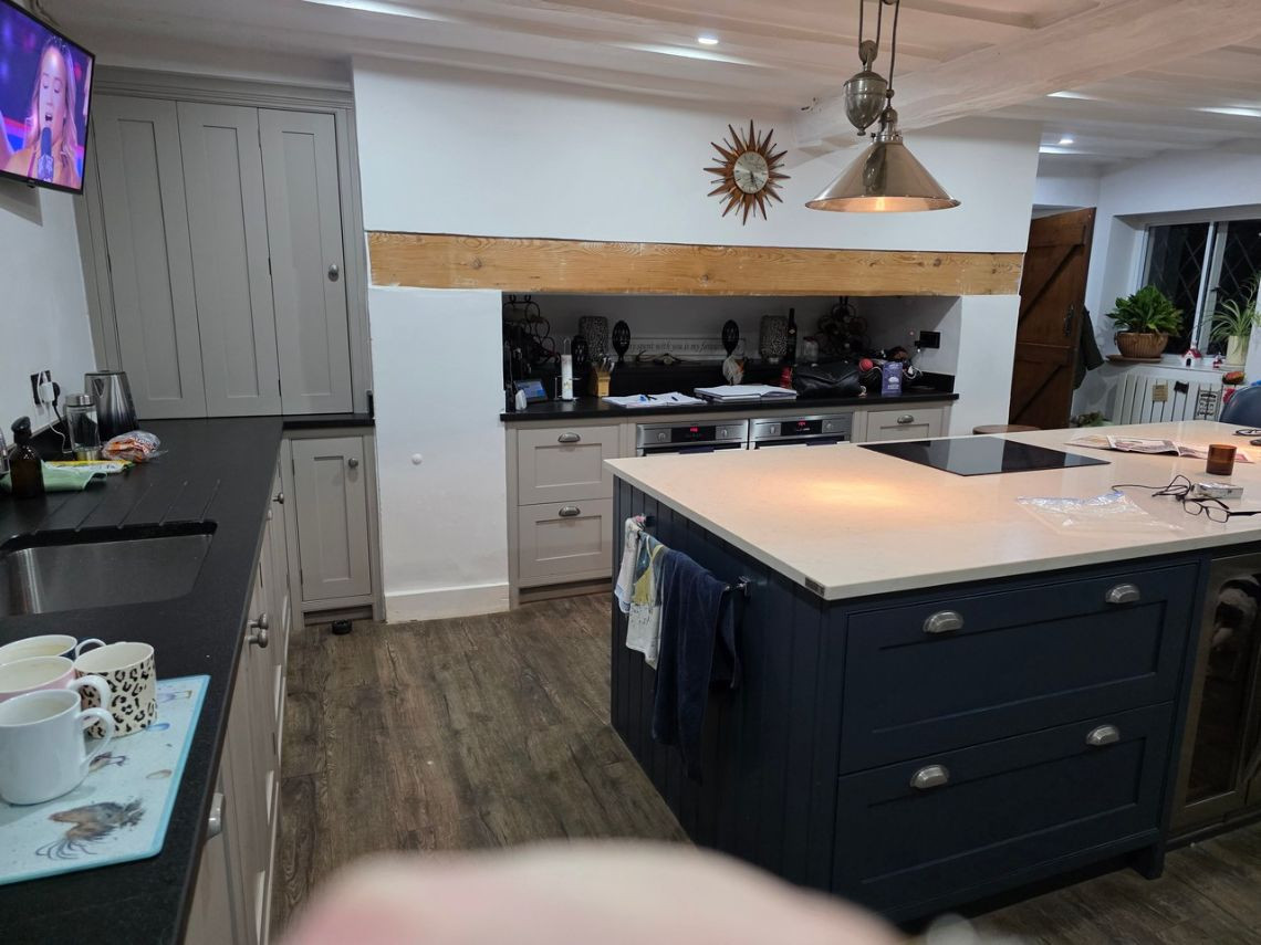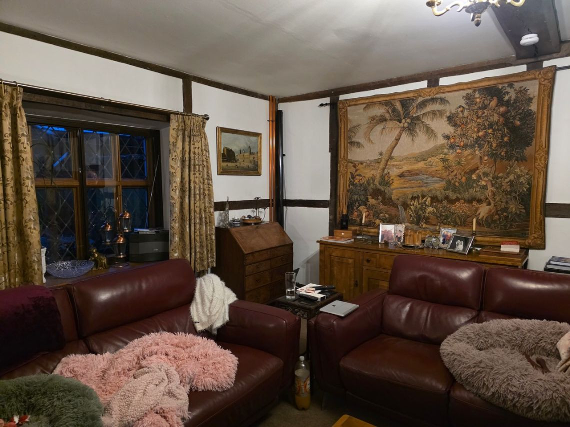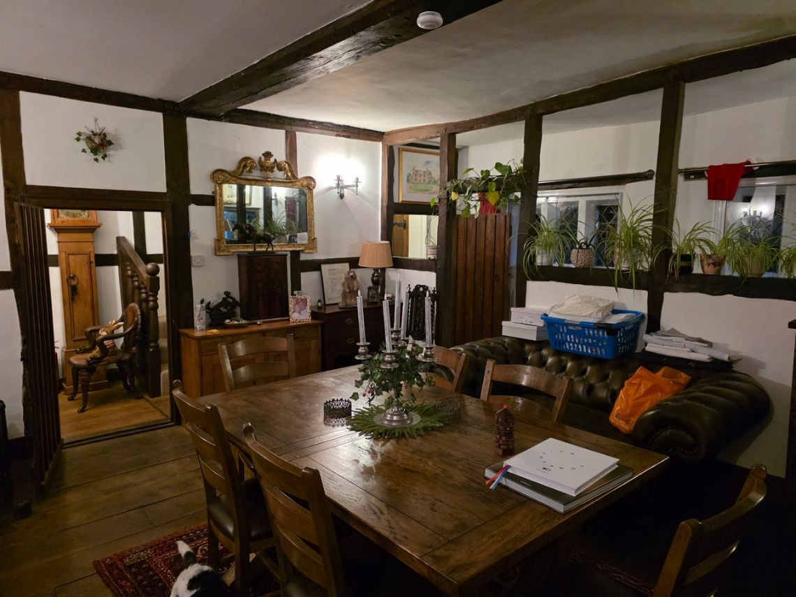 This period home from the 1600's features five bedrooms upstairs. Downstairs There is a large kitchen with an island and a mixture of dark blue and grey units. There is a double oven in the space where the fireplace would have been. The living room features a very large fireplace and oak walls. The dining room has a semi open plan feel and exposed beams. There is also a workout room.