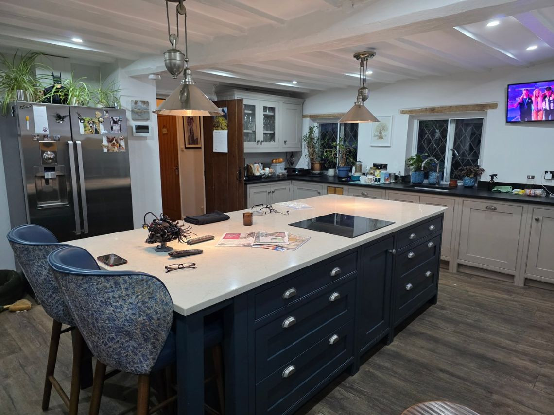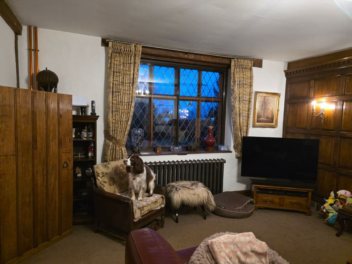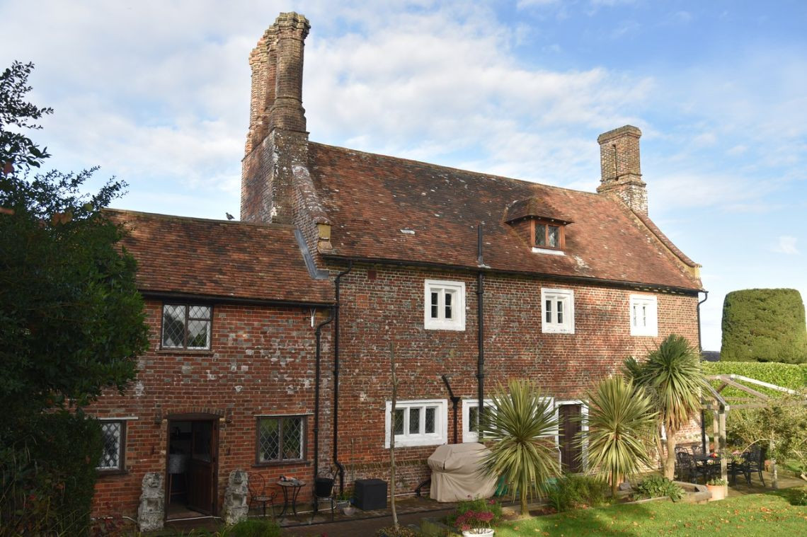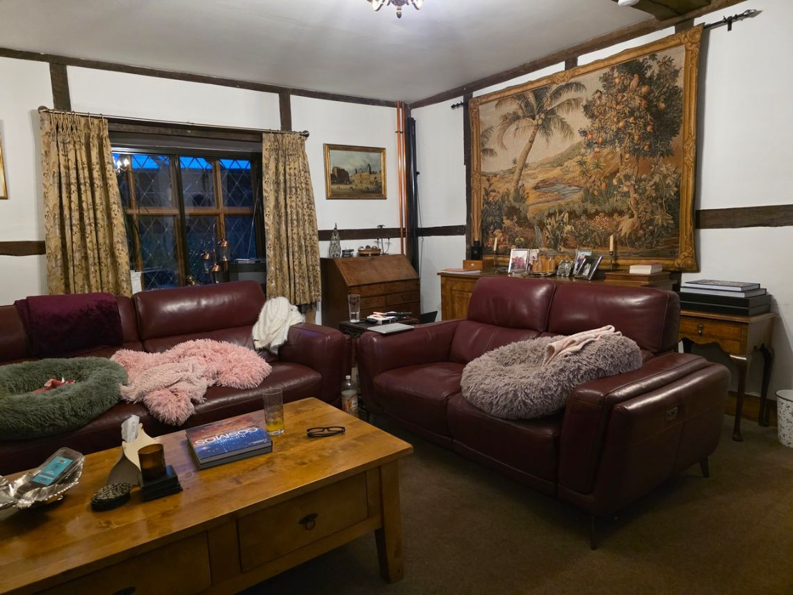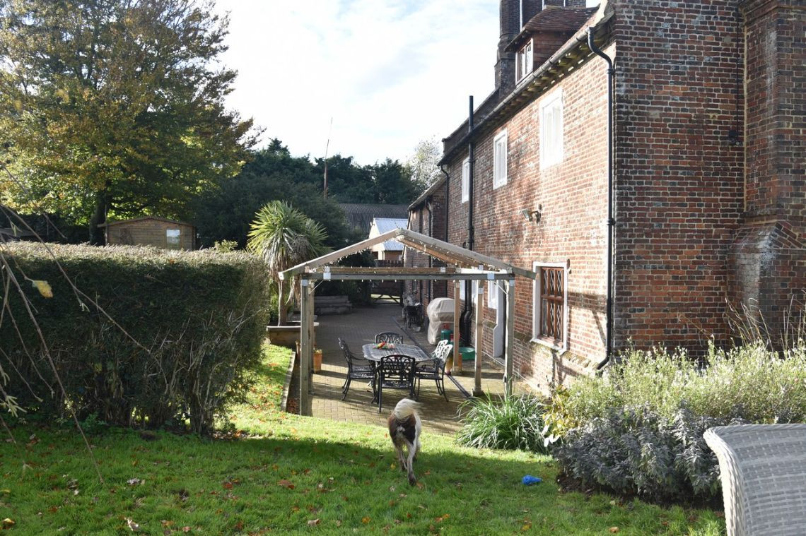 This period home from the 1600's features five bedrooms upstairs. Downstairs There is a large kitchen with an island and a mixture of dark blue and grey units. There is a double oven in the space where the fireplace would have been. The living room features a very large fireplace and oak walls. The dining room has a semi open plan feel and exposed beams. There is also a workout room.