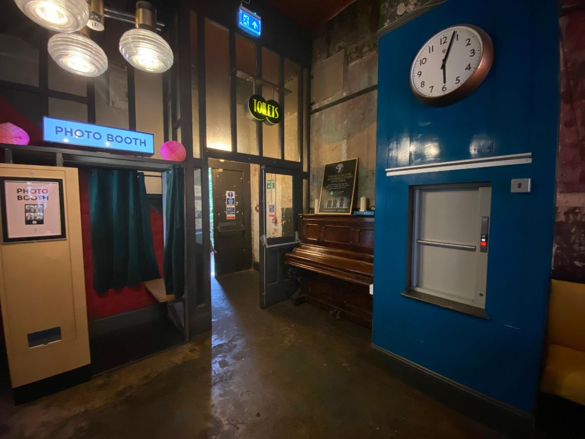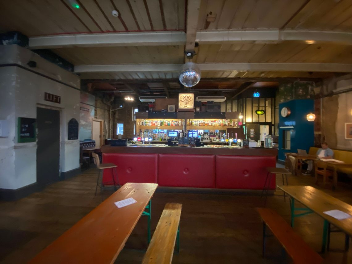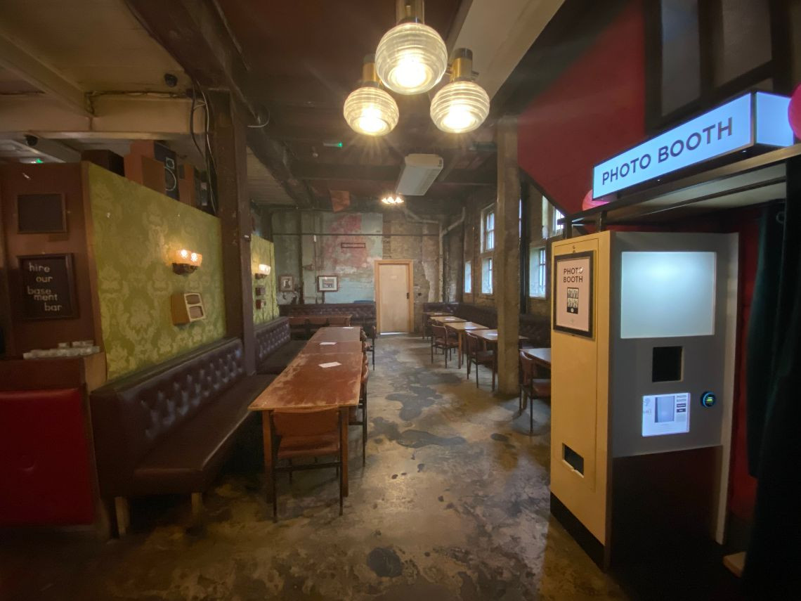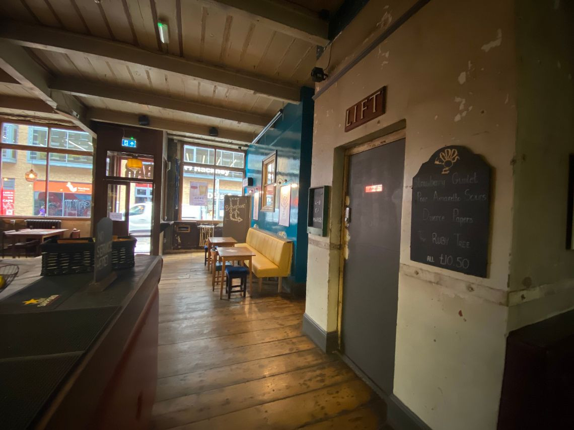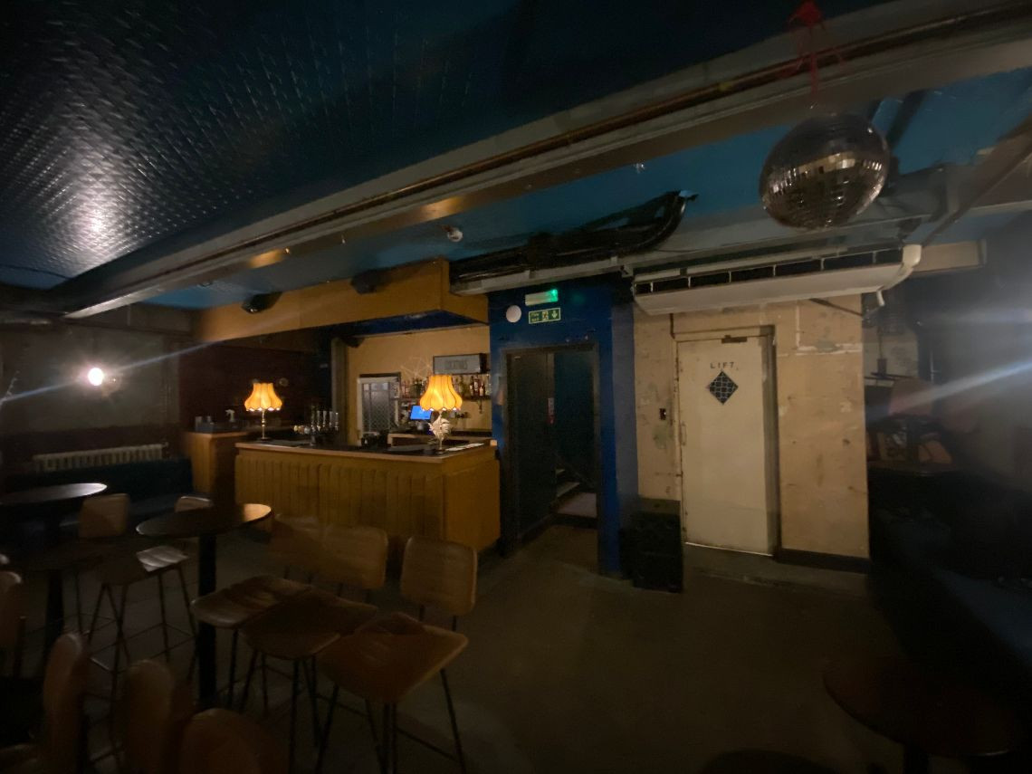 It has the street level floor which is the main bar area, with lots of seating areas, textured walls, and a photo booth. Stylistically it is appealing for film. Then downstairs there is an event space which is empty most of the time. There is a bar down there too, big enough for a substantial film crew, and able to be black out as no windows. There are four toilets at the property - two on the basement level, and then two on the first floor above the main pub. There are also three more floors above the pub that are currently disused and derelict, but spacious and can be made safe for a film crew.