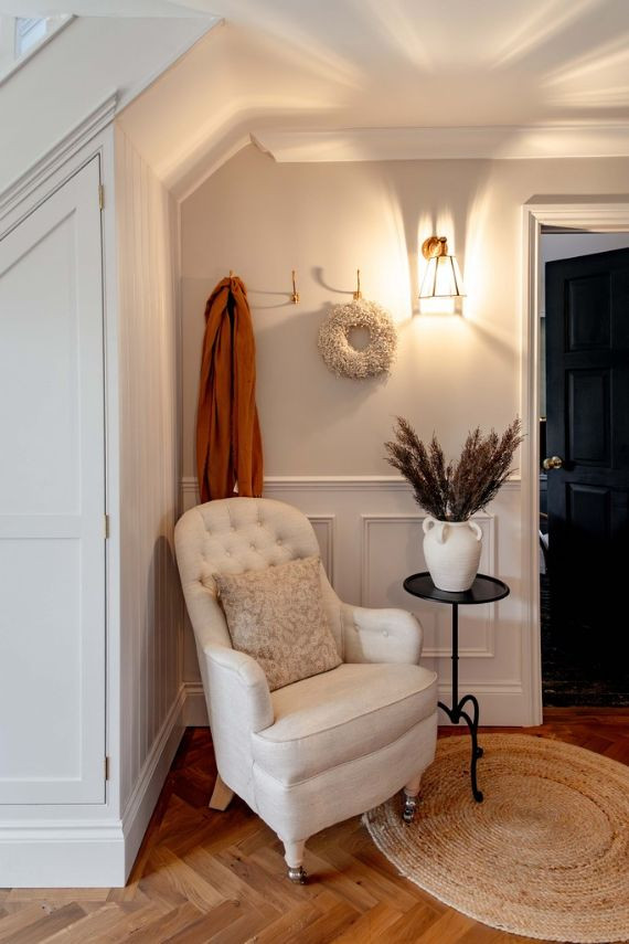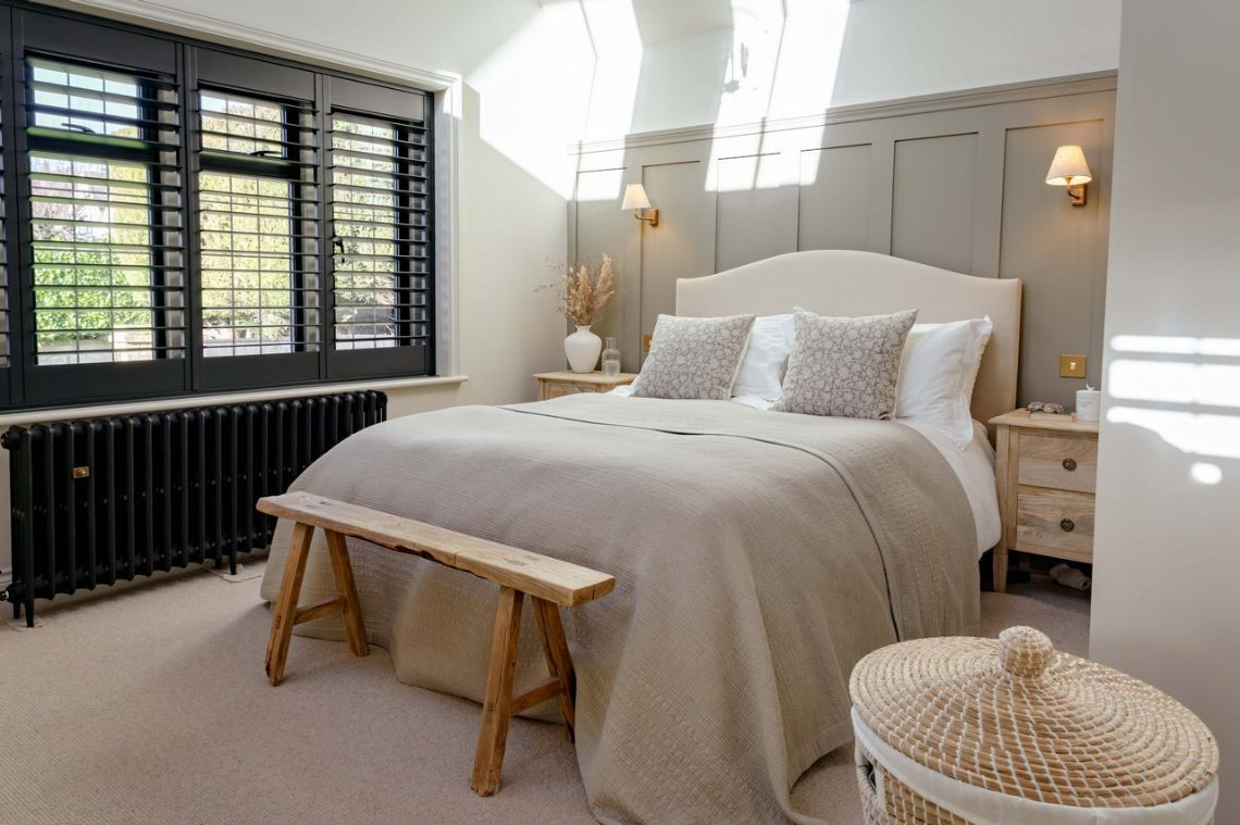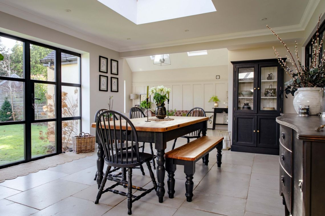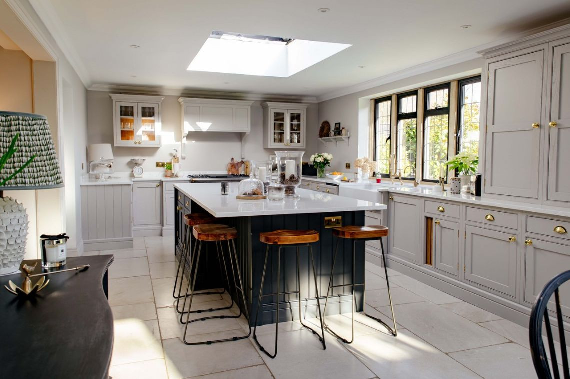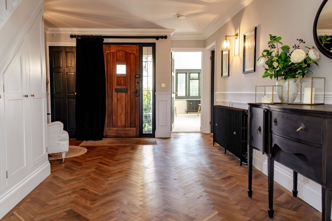 A beautiful quiet and bright renovated home for filming. The spacious hall features wooden herringbone flooring which leads to a bright living room. This room has a glass wall flooding it with light, mixing modern features with classic features. Several rooms have wooden panelling and skylights. The Kitchen features a large island as well as a dining table. This space features two Velux windows as well as two roof lanterns.