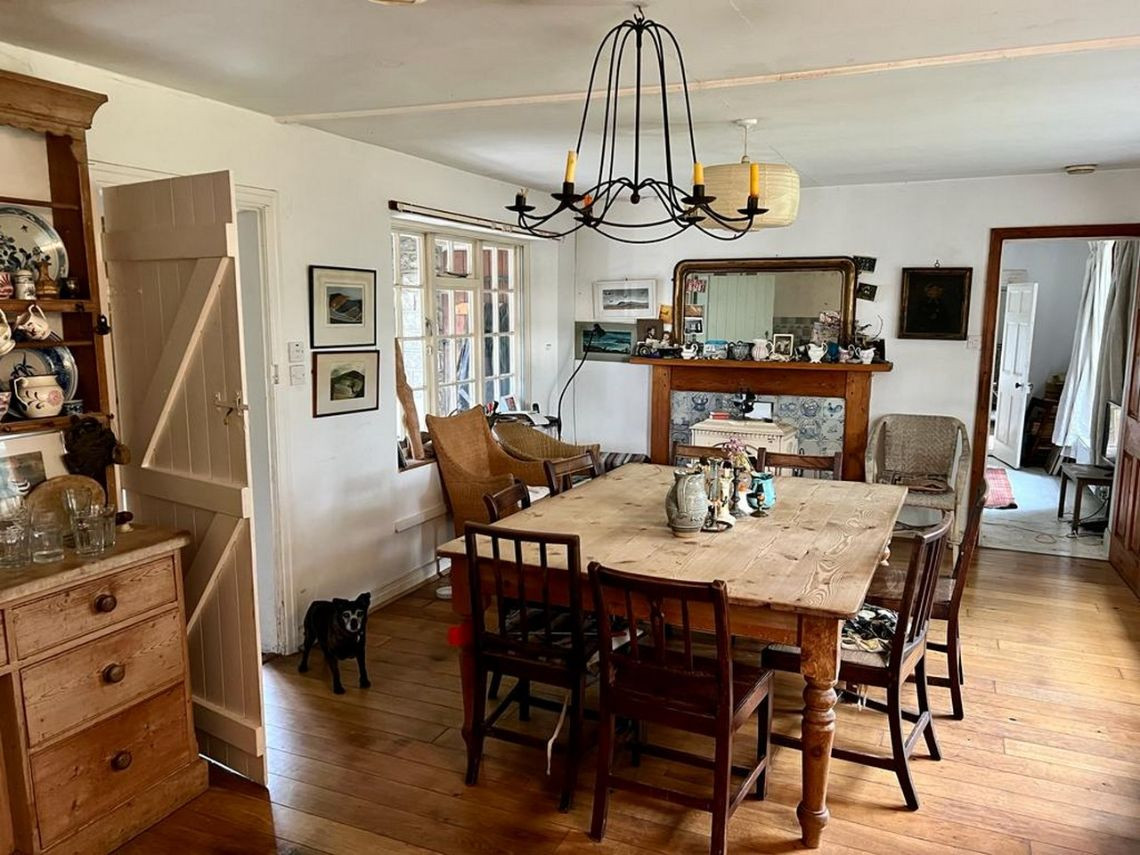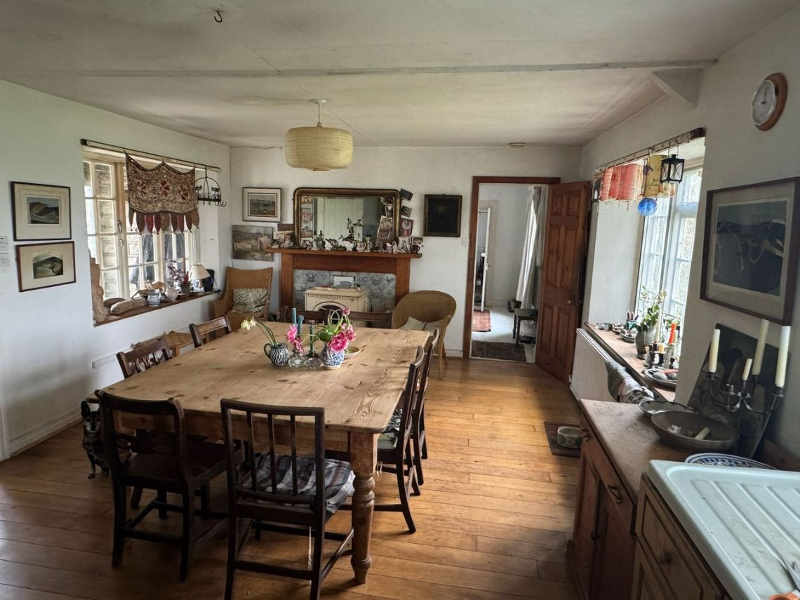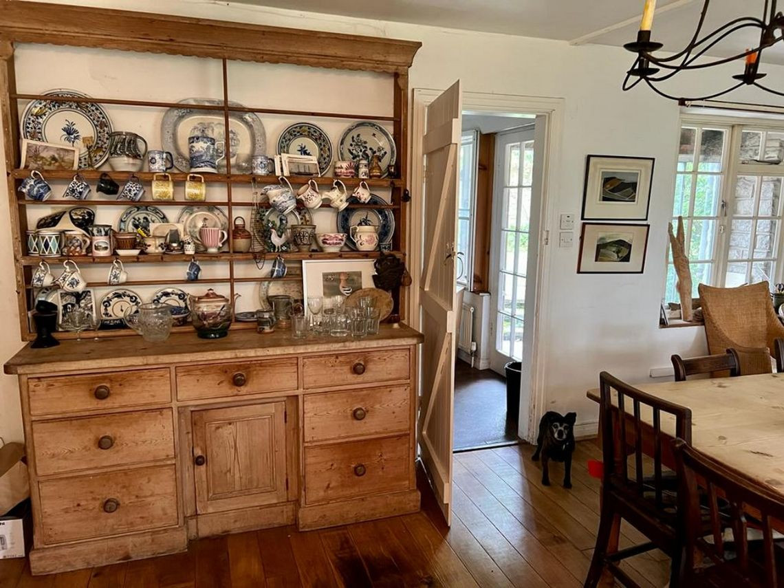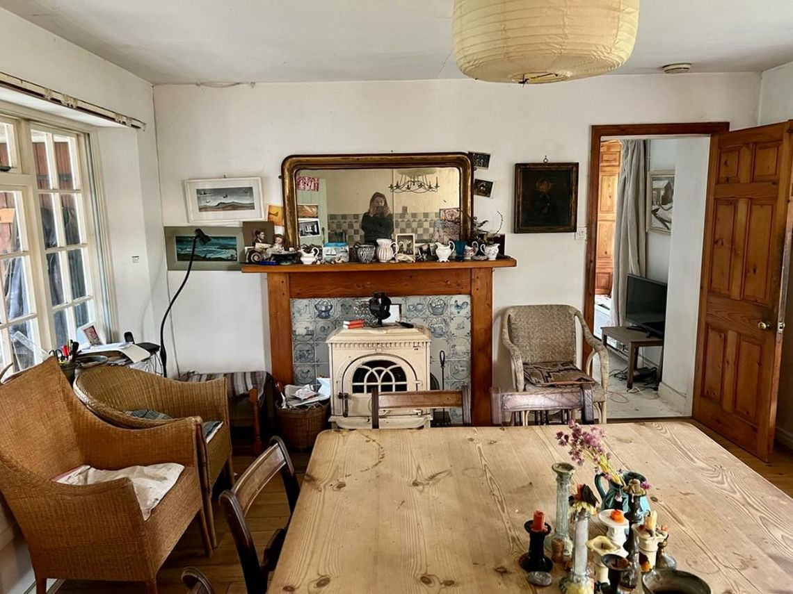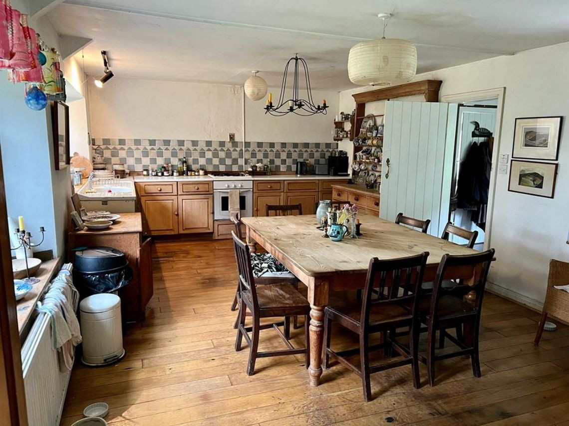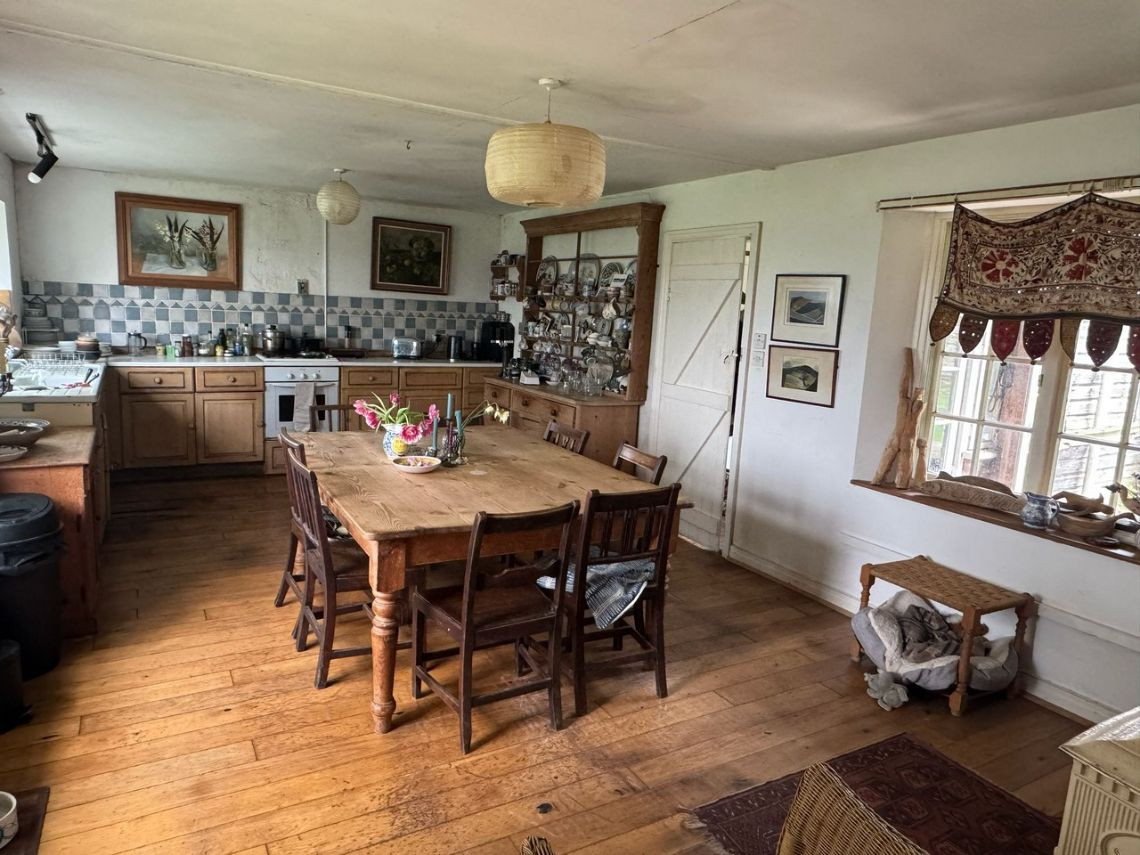 Bohemian and arty farmhouse with some run down rooms. Lots of items and art fill the rooms. Mostly on the lower level you have to walk through rooms to enter the others. Lots of working fireplaces and log burners throughout the property. The property has a mix of stone, wooden and carpeted floors. The kitchen diner features rustic wooden units, dining table and a large dresser.