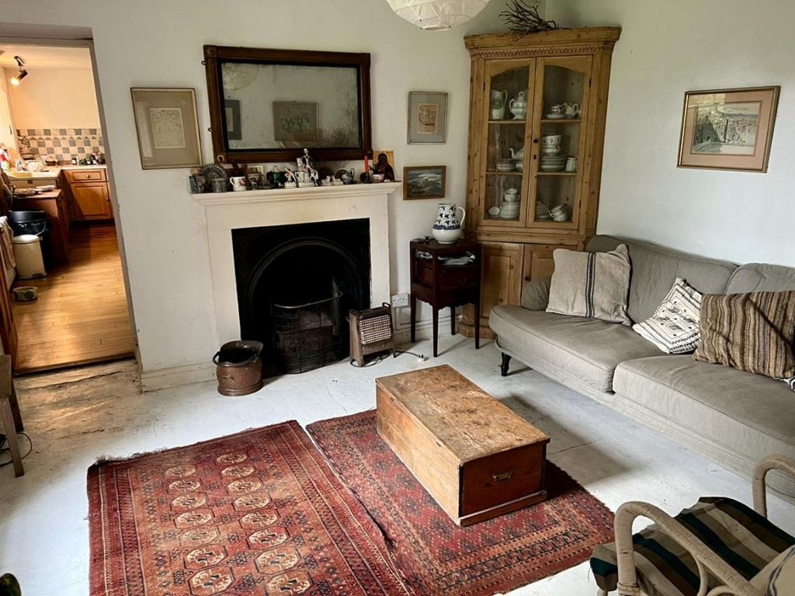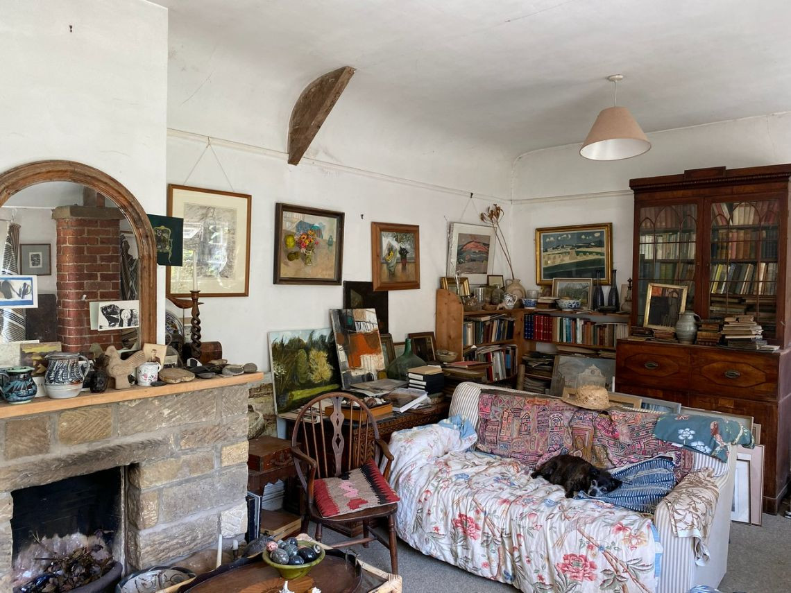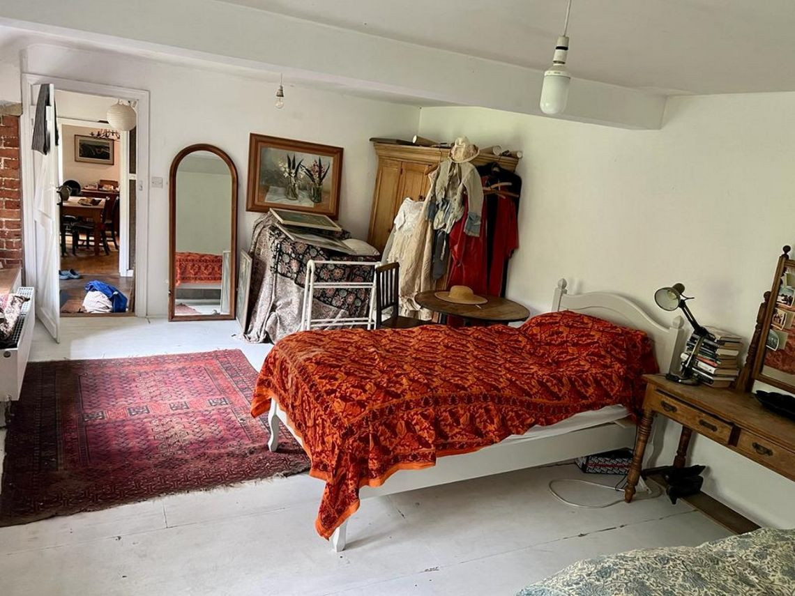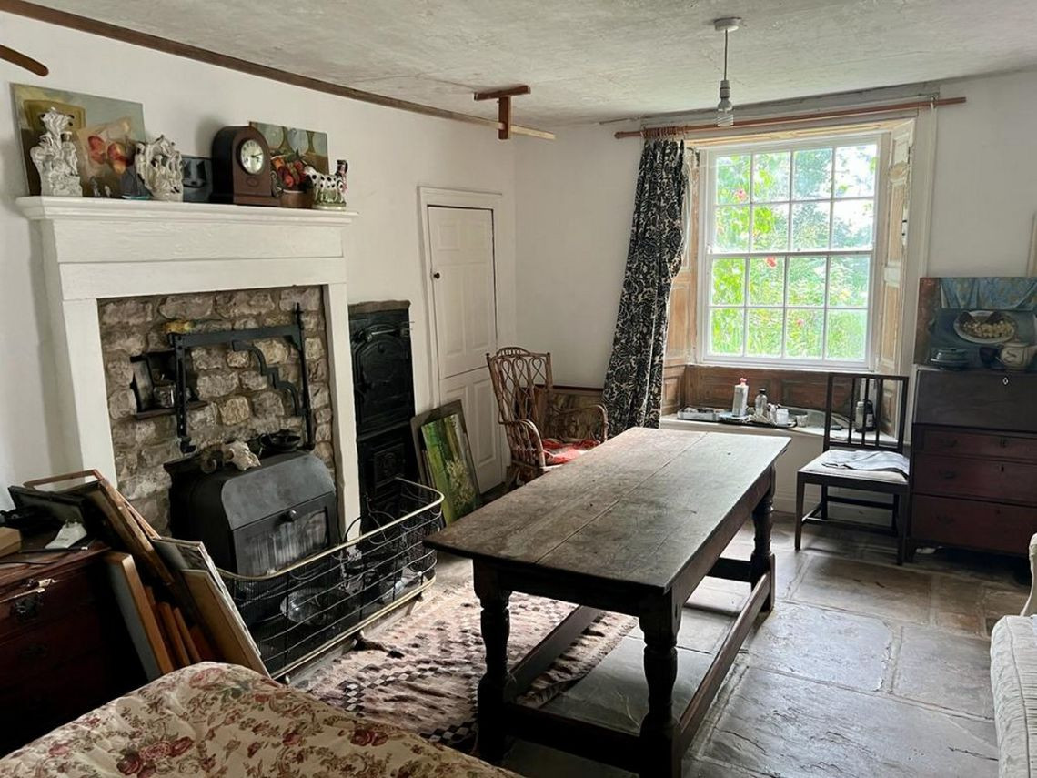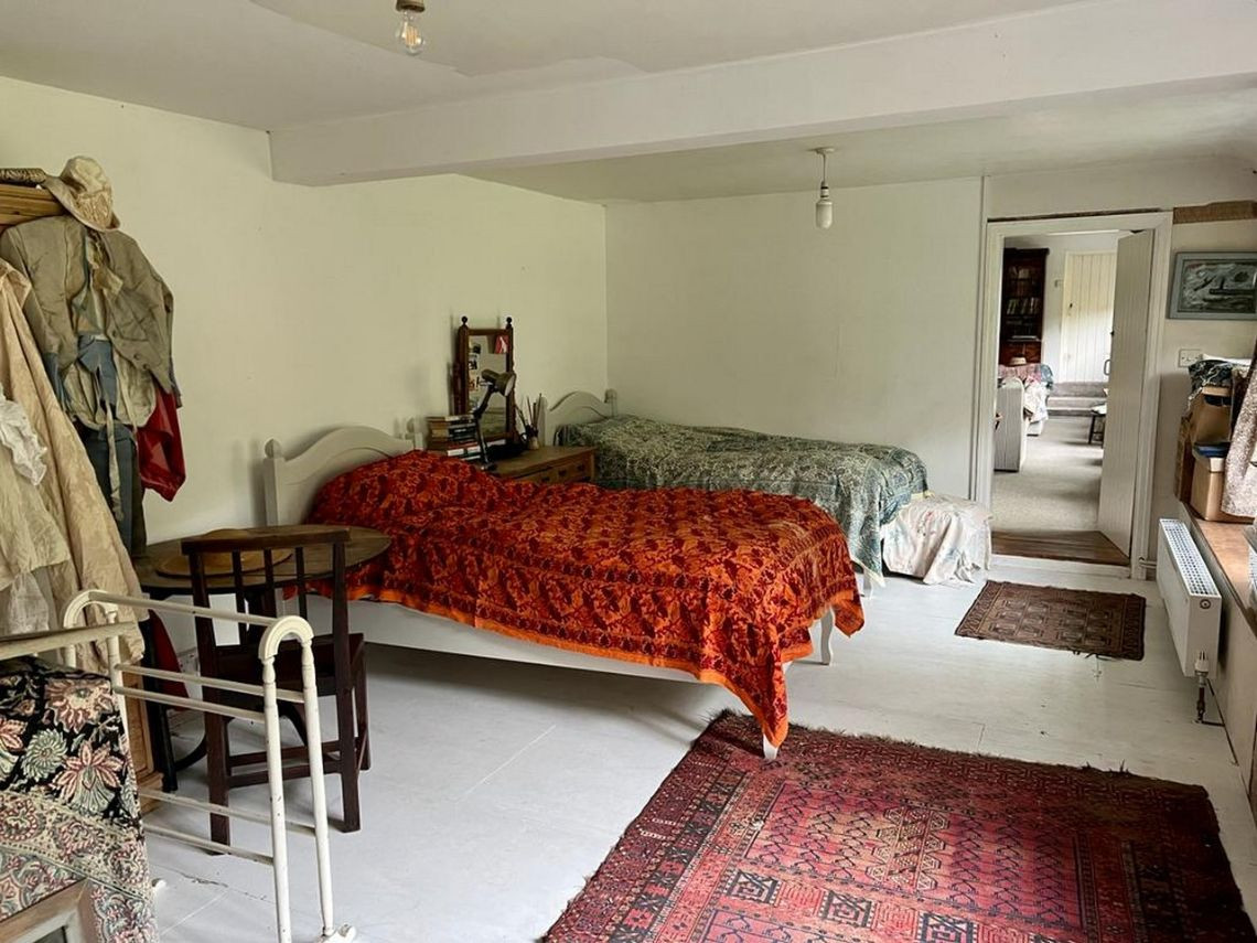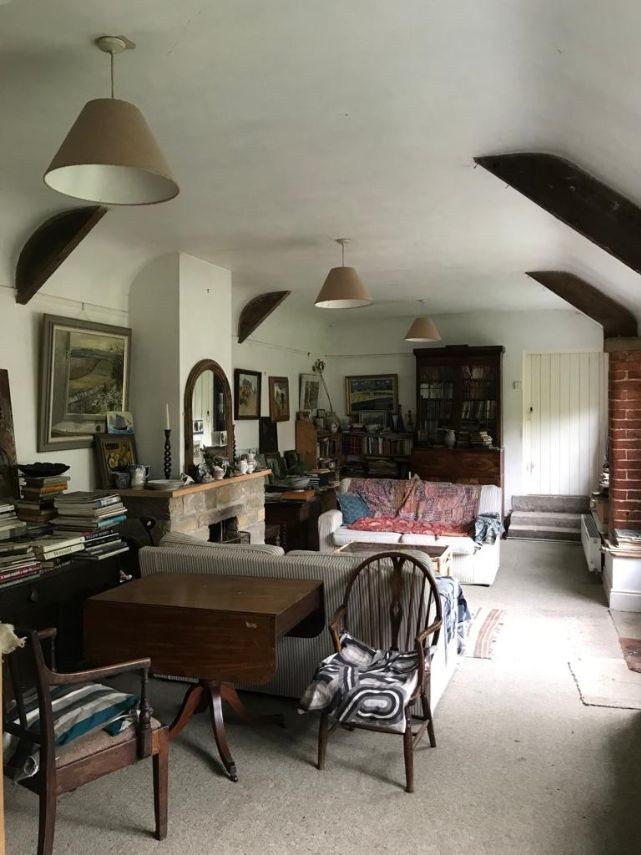 Bohemian and arty farmhouse with some run down rooms. Lots of items and art fill the rooms. Mostly on the lower level you have to walk through rooms to enter the others. Lots of working fireplaces and log burners throughout the property. The property has a mix of stone, wooden and carpeted floors. The kitchen diner features rustic wooden units, dining table and a large dresser.