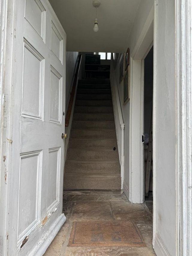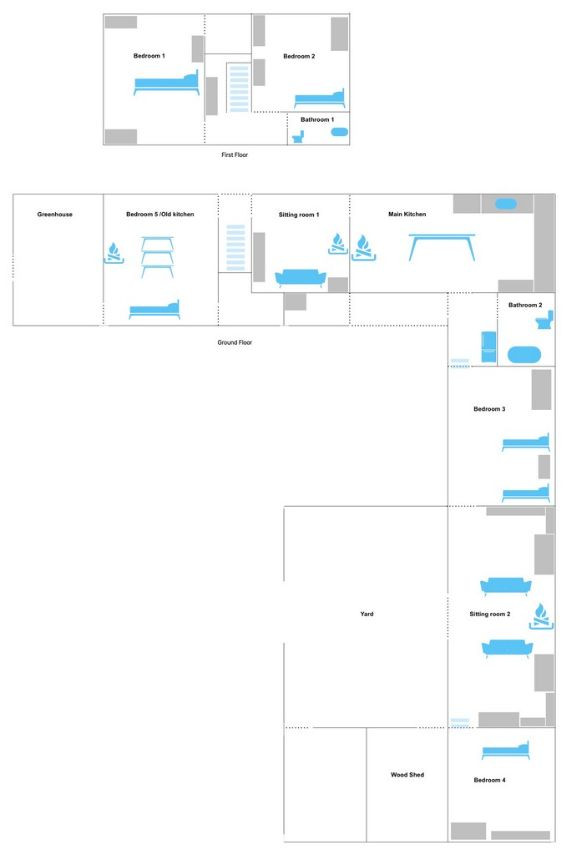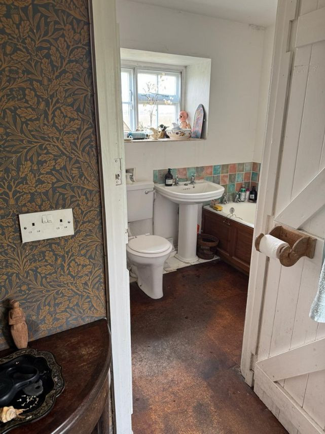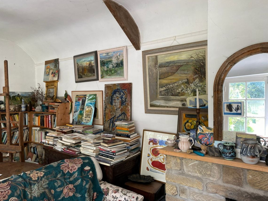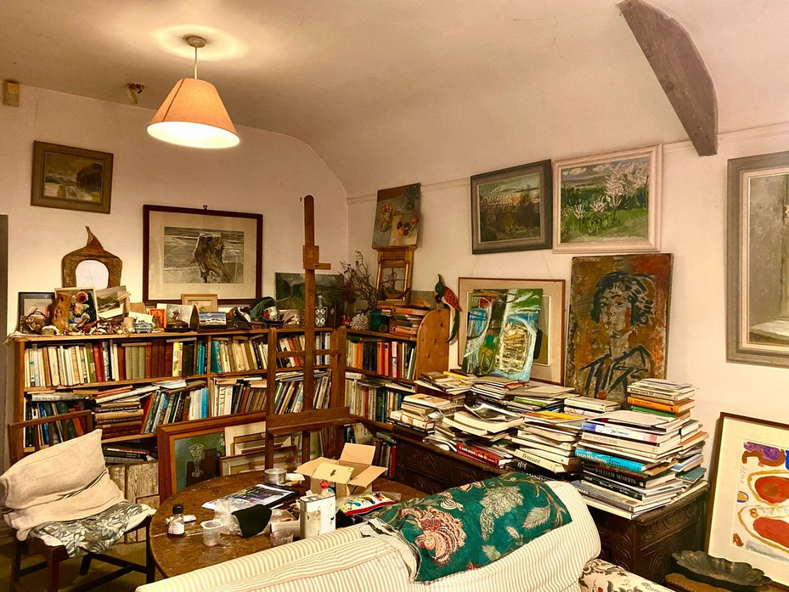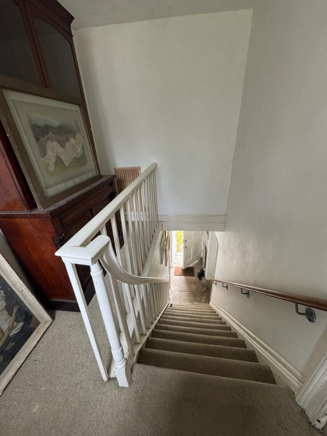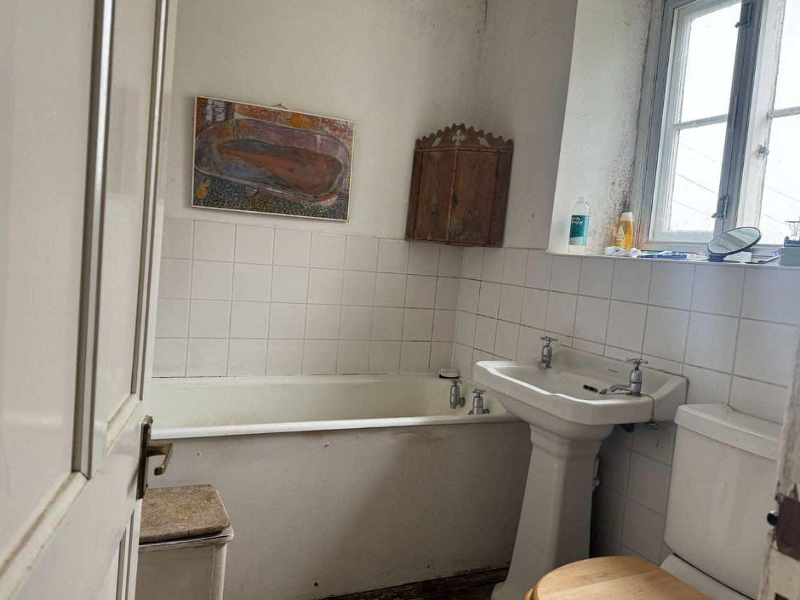 Bohemian and arty farmhouse with some run down rooms. Lots of items and art fill the rooms. Mostly on the lower level you have to walk through rooms to enter the others. Lots of working fireplaces and log burners throughout the property. The property has a mix of stone, wooden and carpeted floors. The kitchen diner features rustic wooden units, dining table and a large dresser.