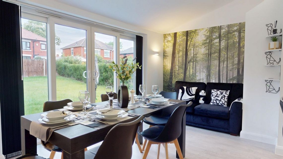 A bright and modern interior with spacious rooms. Downstairs features a front living room with a wood clad feature wall. The rear of the house has an open plan kitchen diner. The kitchen features dark gray units and a white worktop. The dining space is spacious and includes a sofa with a wallpaper mural behind. The room is very bright due to the large windows and French doors across the back of the extension.