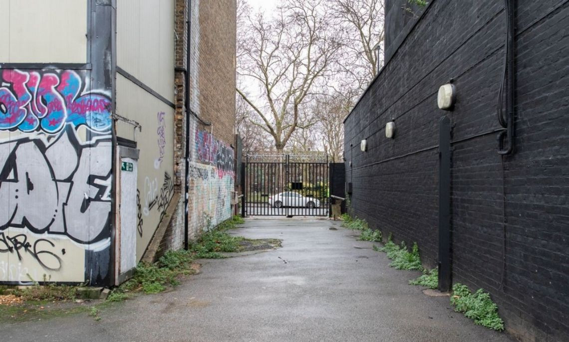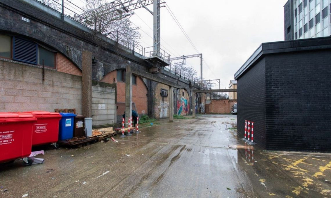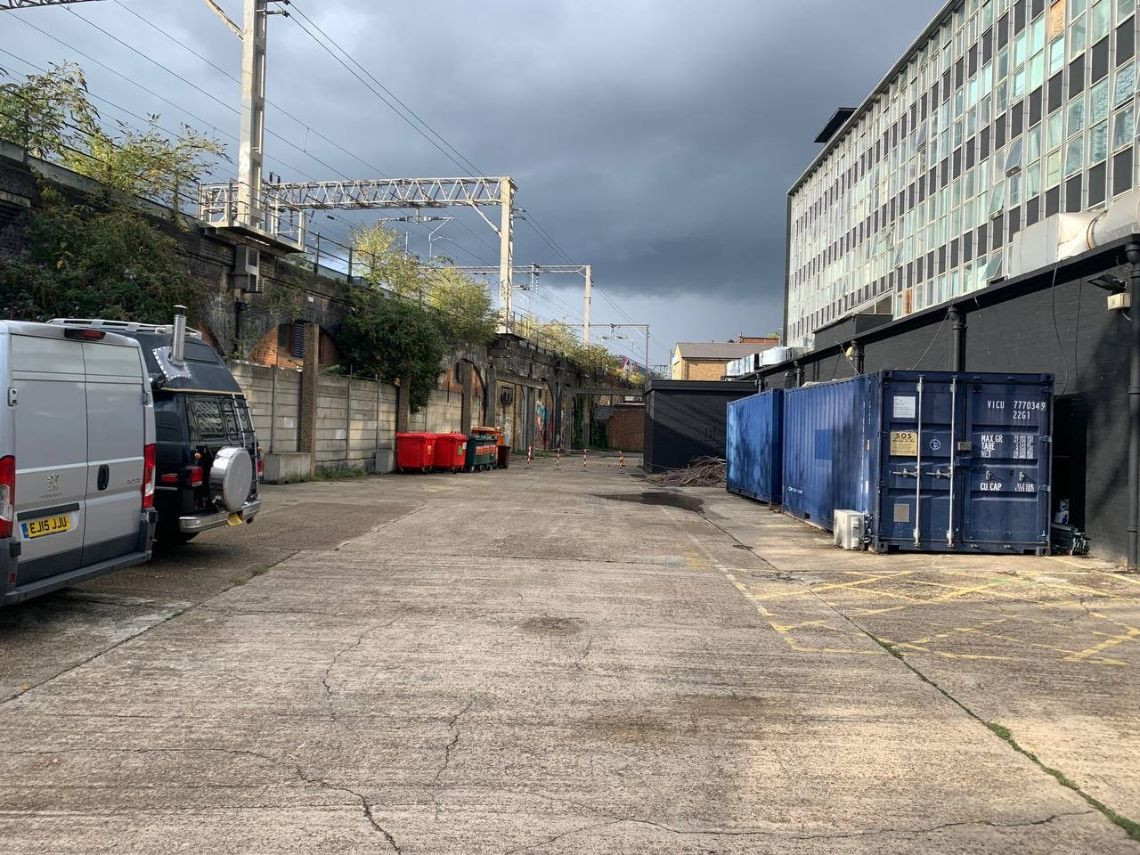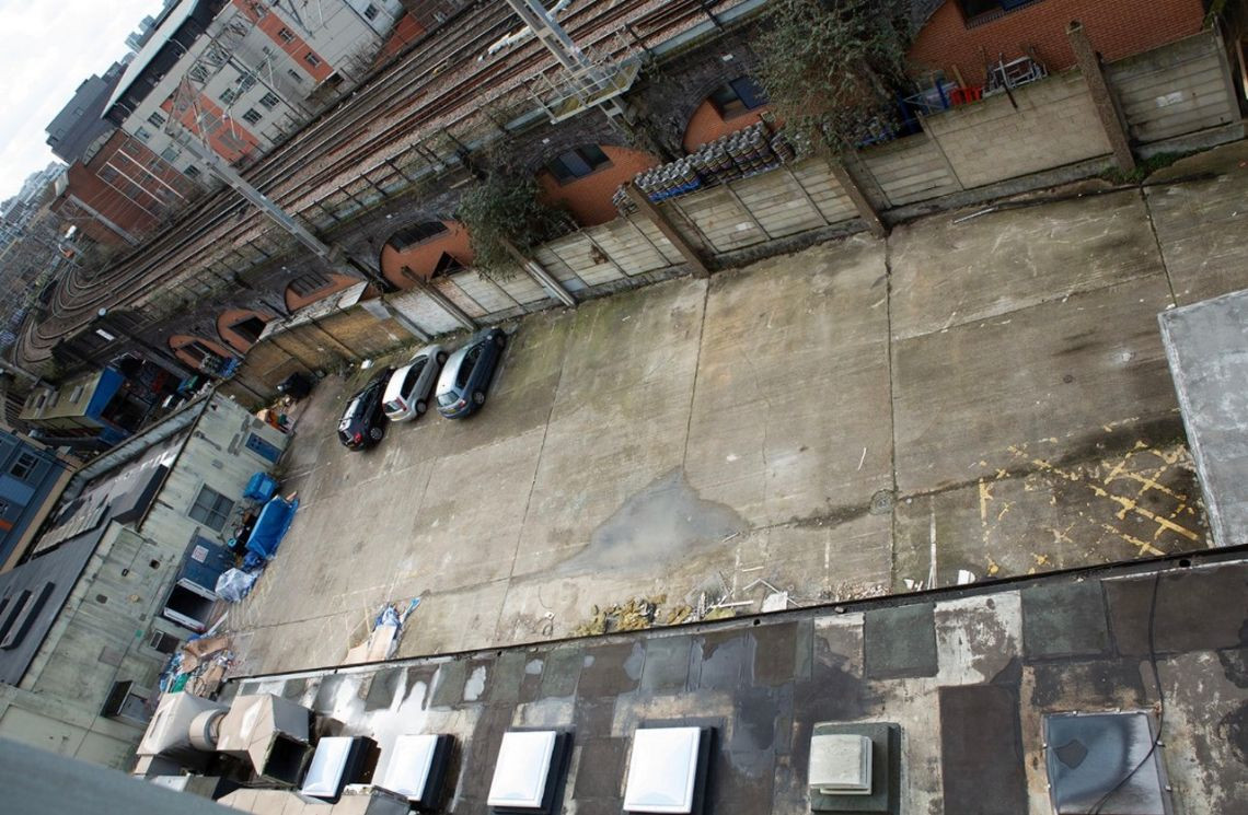 A centrally located out door car park with graffiti and several different sections for filming. The car park is gated and next to brick railway arches and an active railway.