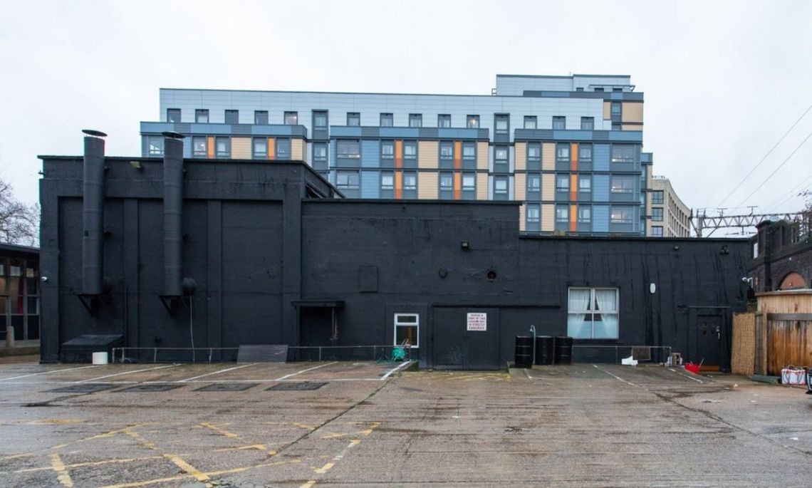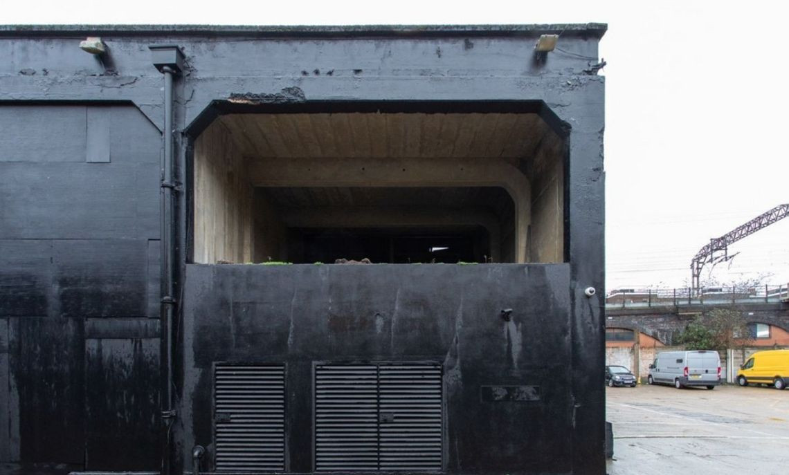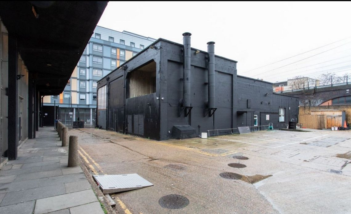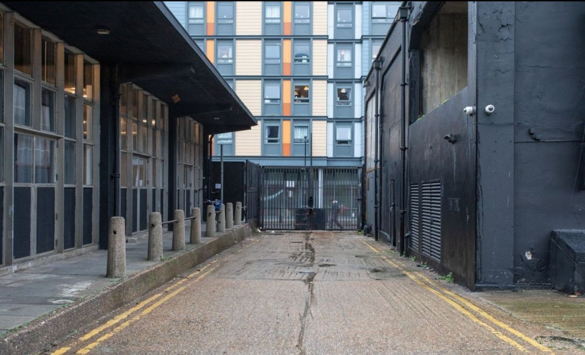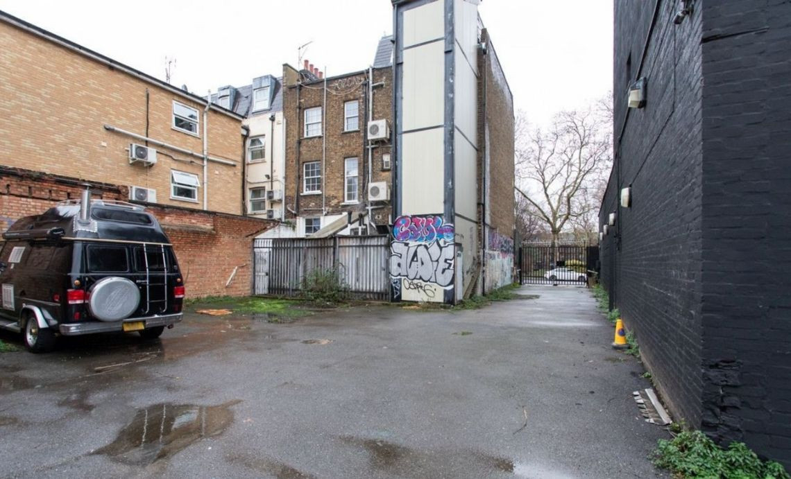 A centrally located out door car park with graffiti and several different sections for filming. The car park is gated and next to brick railway arches and an active railway.